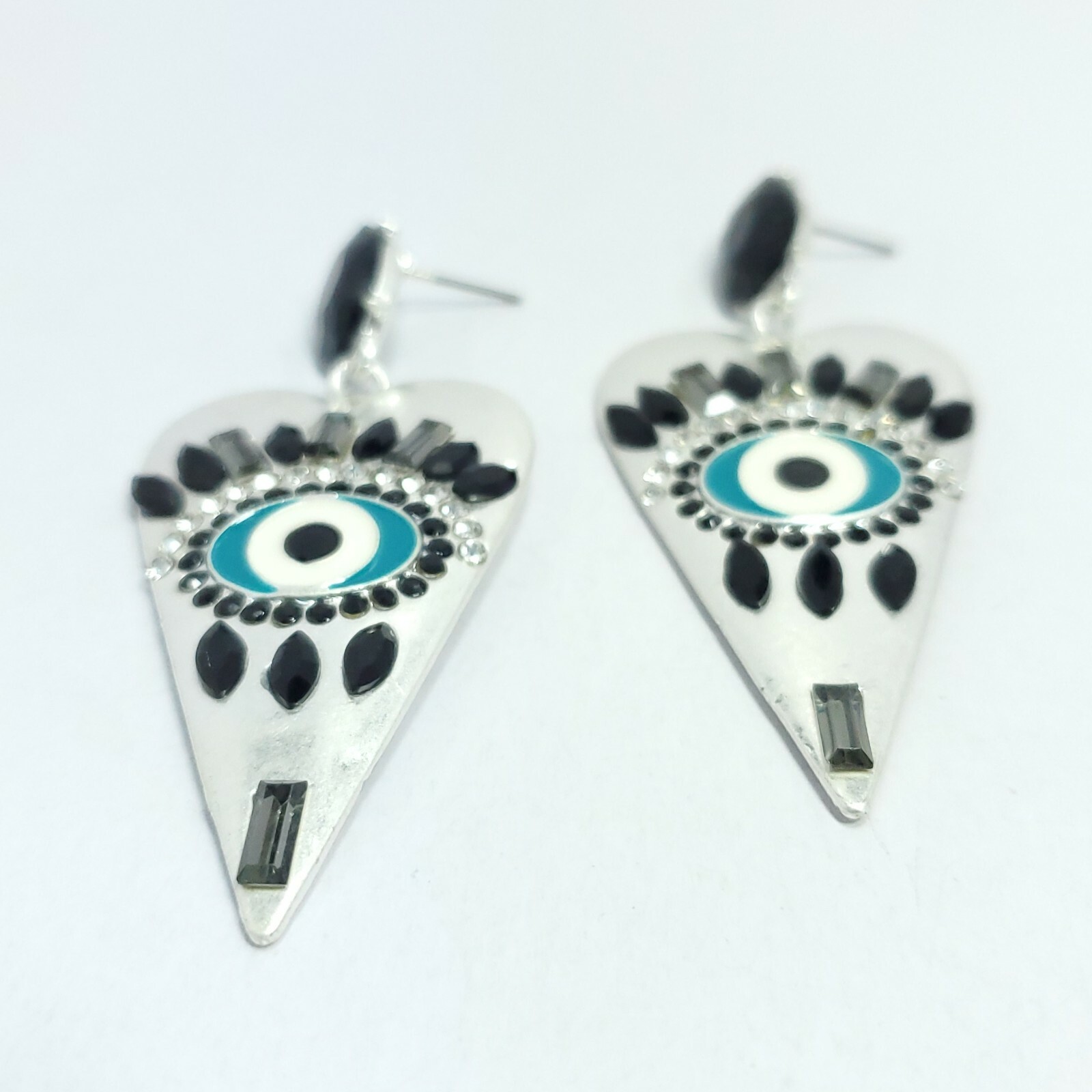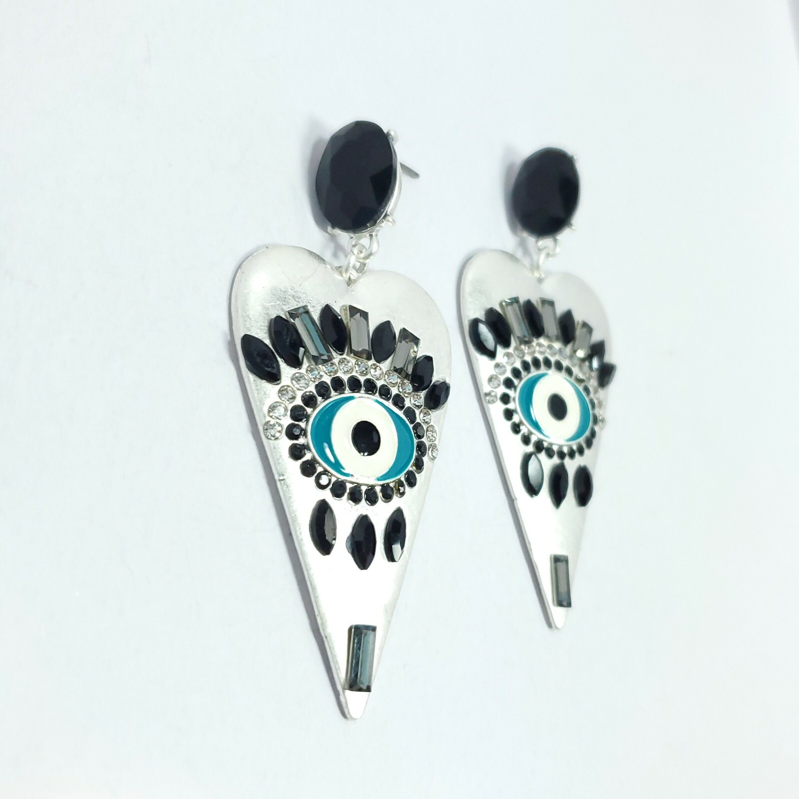 E0210 Silver Tone Long Heart Evil Eye Rhinestones Drop Dangle Post Earrings