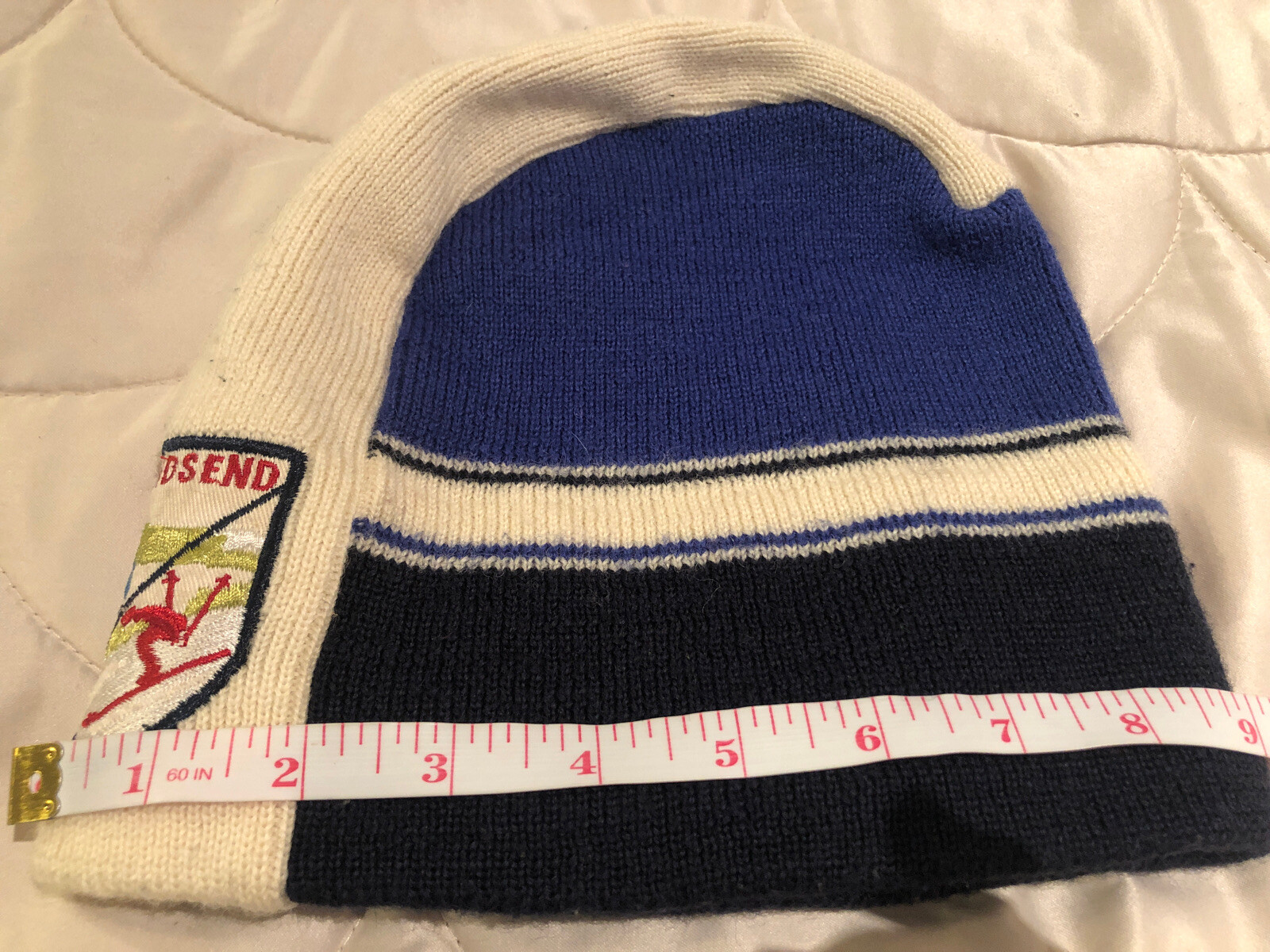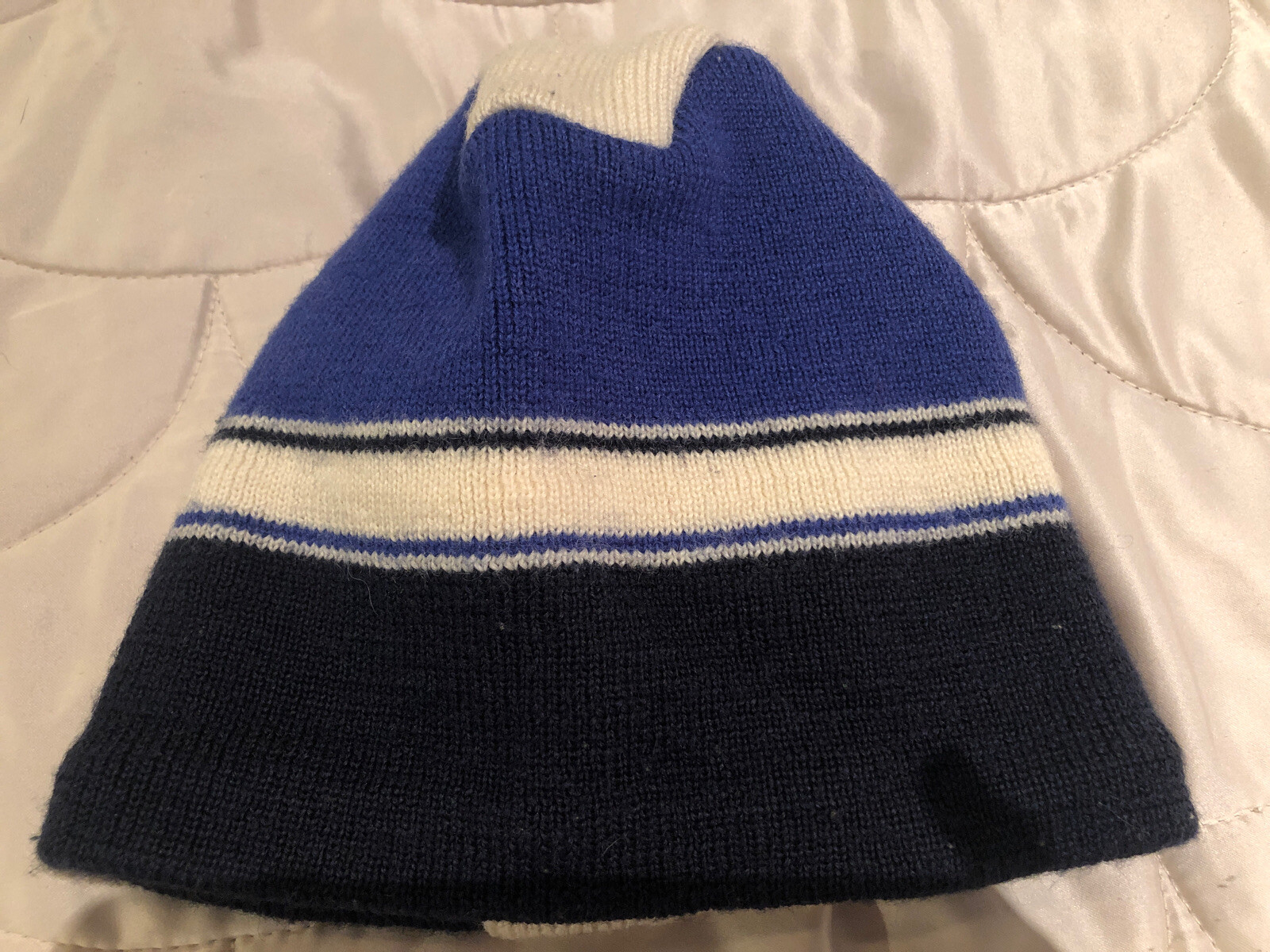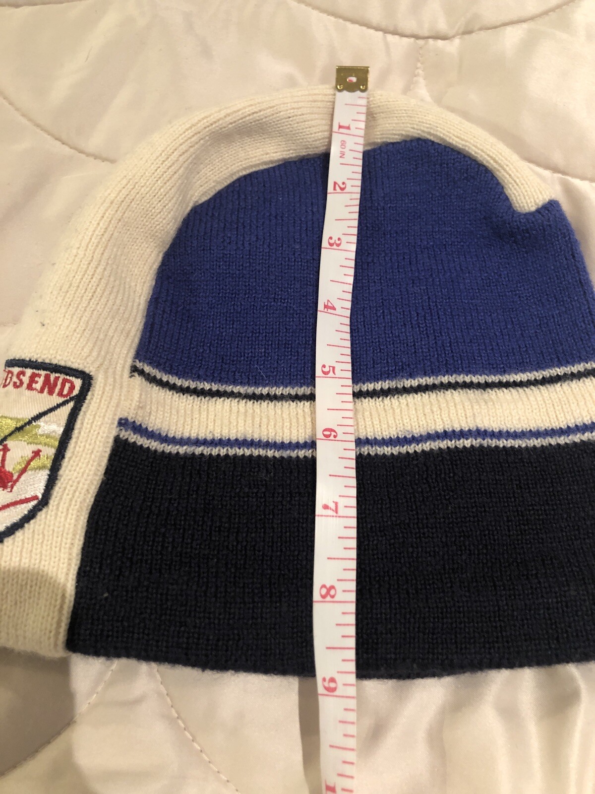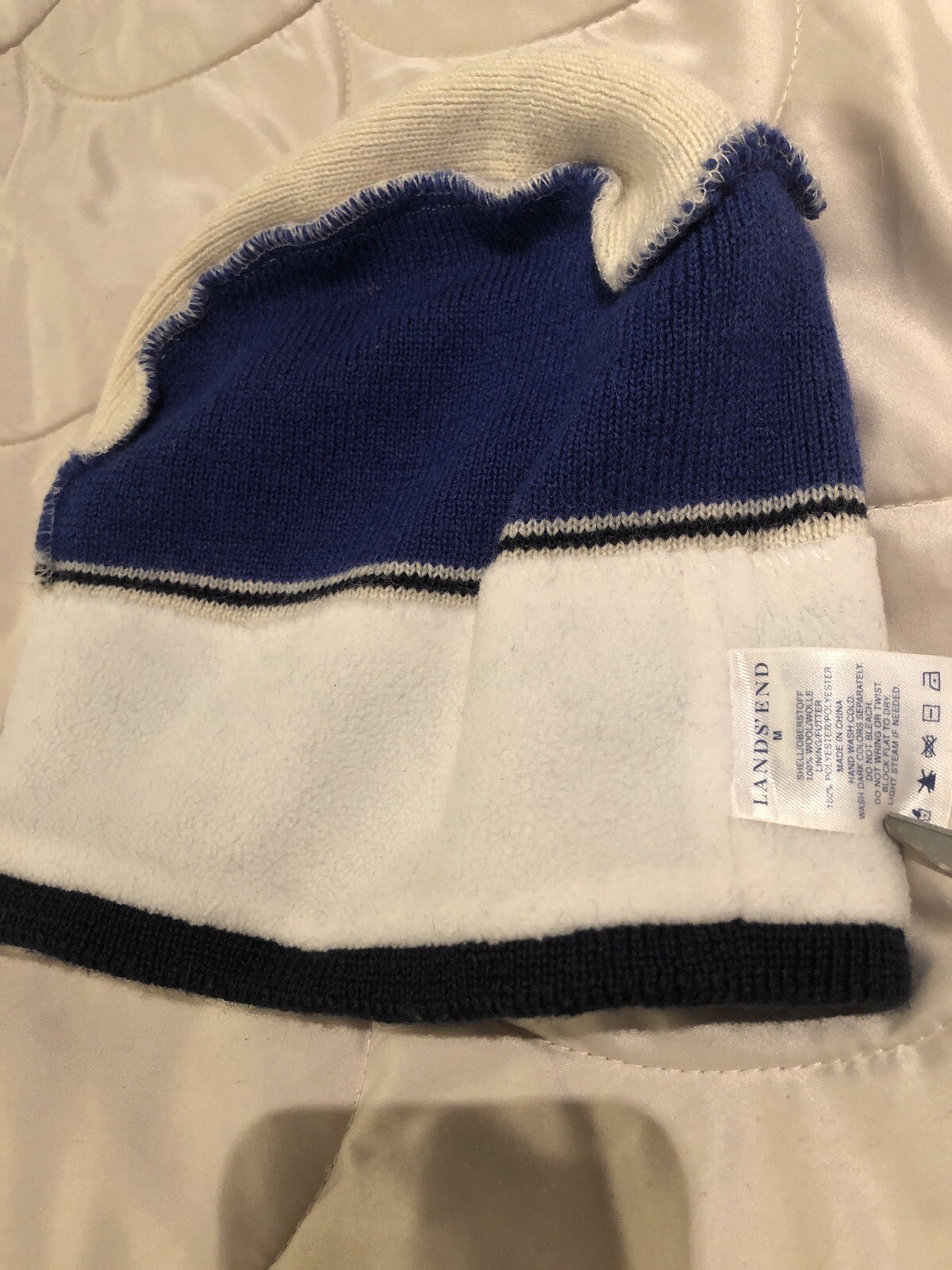 LandsEnd Ski Beanie, Ski/sail Patch, Blue And White. Outer Wool Ear Fleece Larg