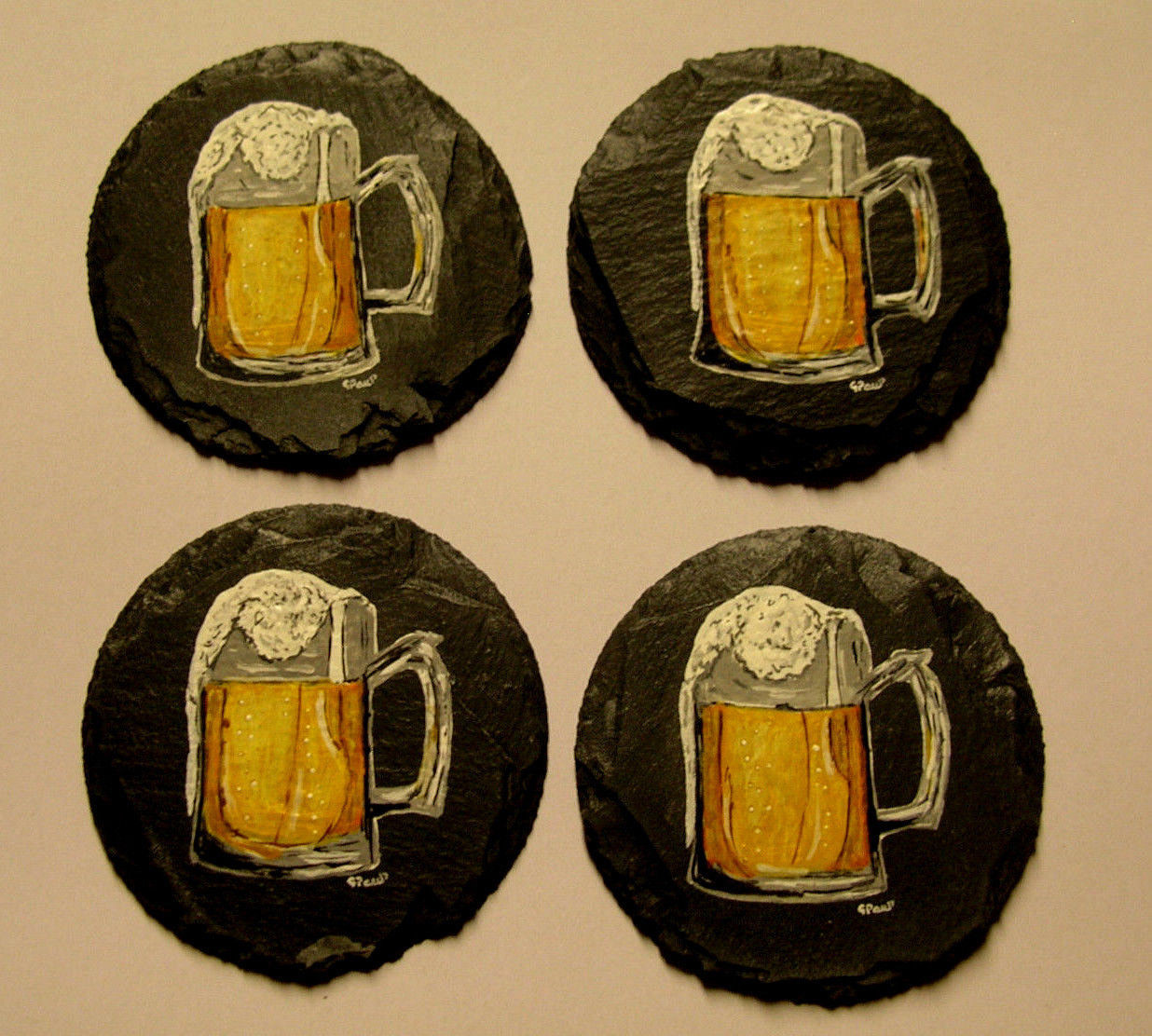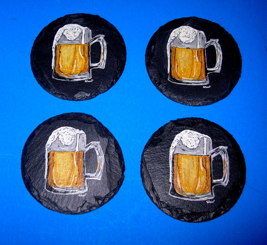 NEW HANDCRAFTED HANDPAINTED SLATE FROTHY MUG of BEER COASTERS SET 4