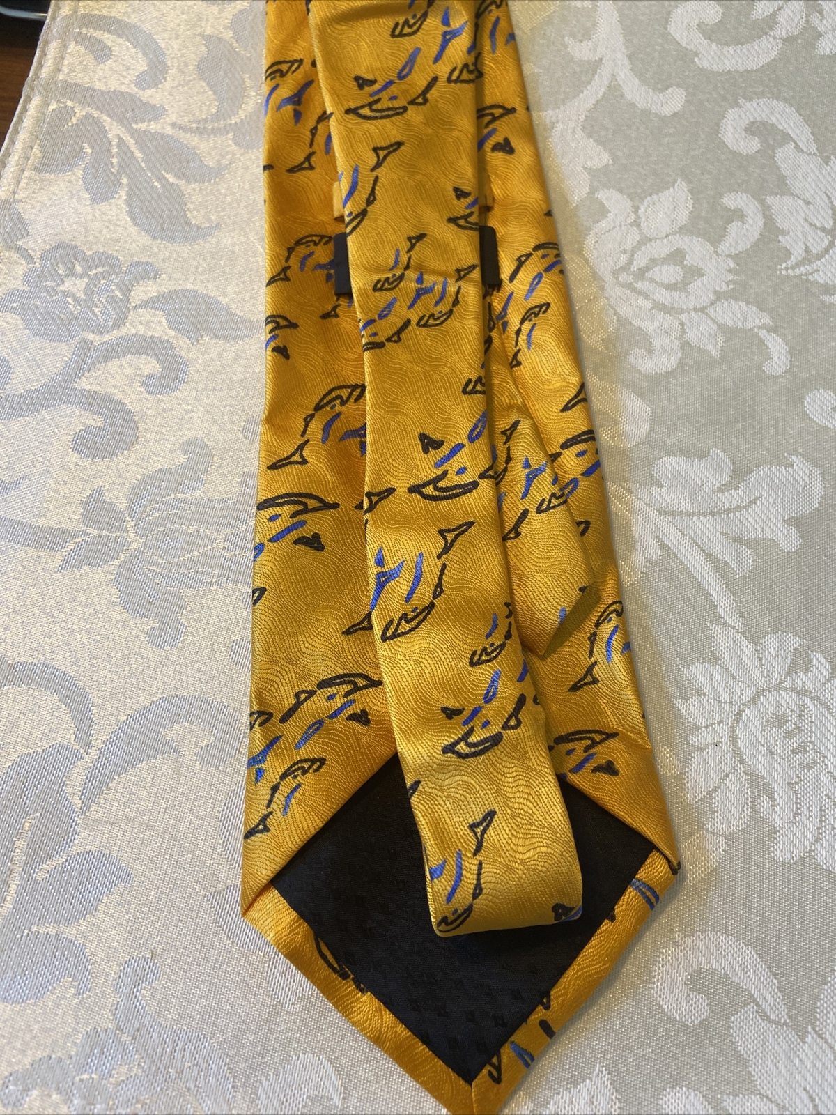 как выглядит Dolphin Tie Printed 100 SILK NECKTIE Yellow with Blue Black Dolphins - NEW фото