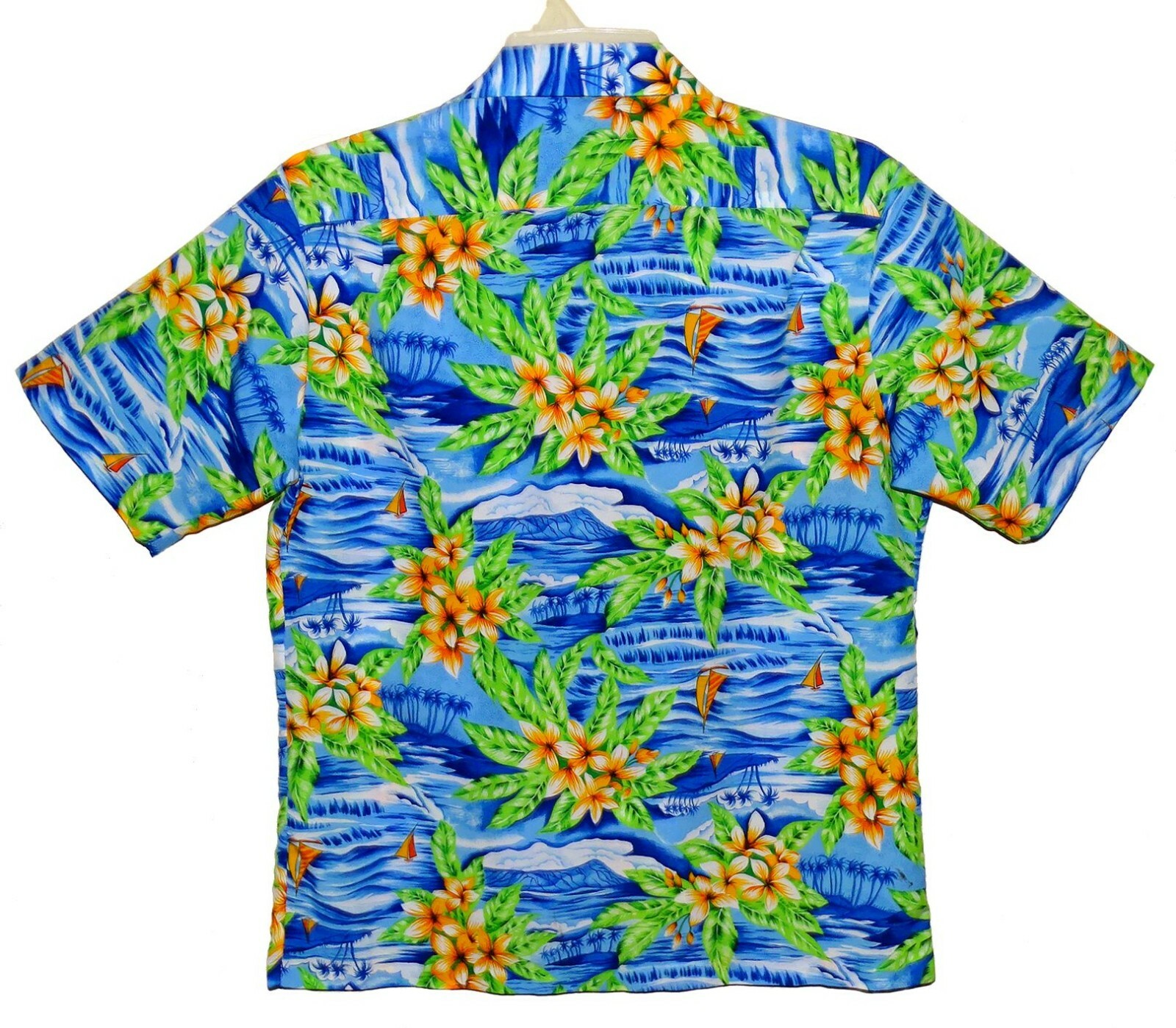 Vin Sz L 60's-70's Hilo Hattie's Hawaiian Aloha Shirt Tropical Flowers Blue Poly
