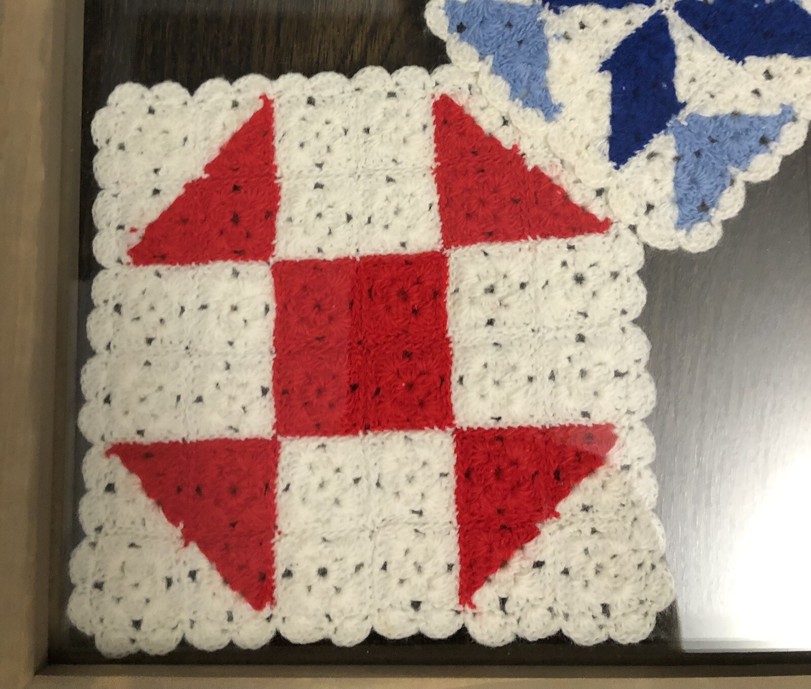 2 Framed vintage crocheted quilt squares In Red And Blue