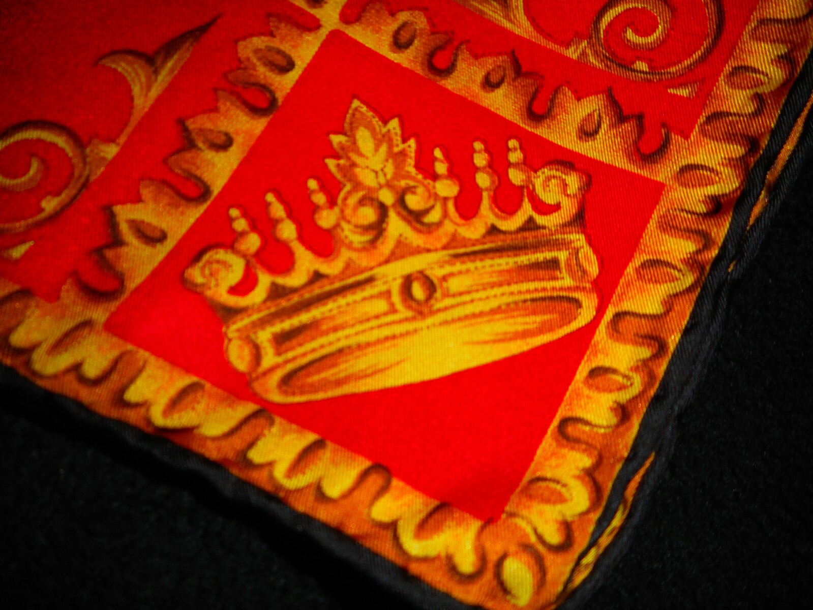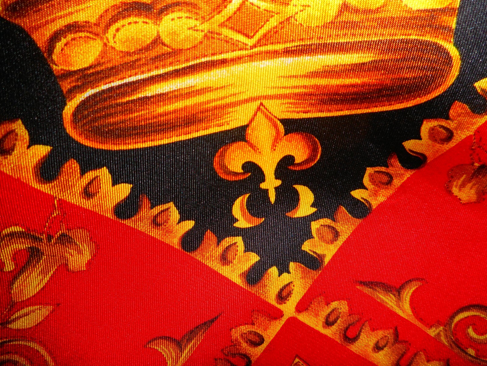 Large Silk Scarf Gold Black Red Fleur de Lis Crown Royalty USA 34