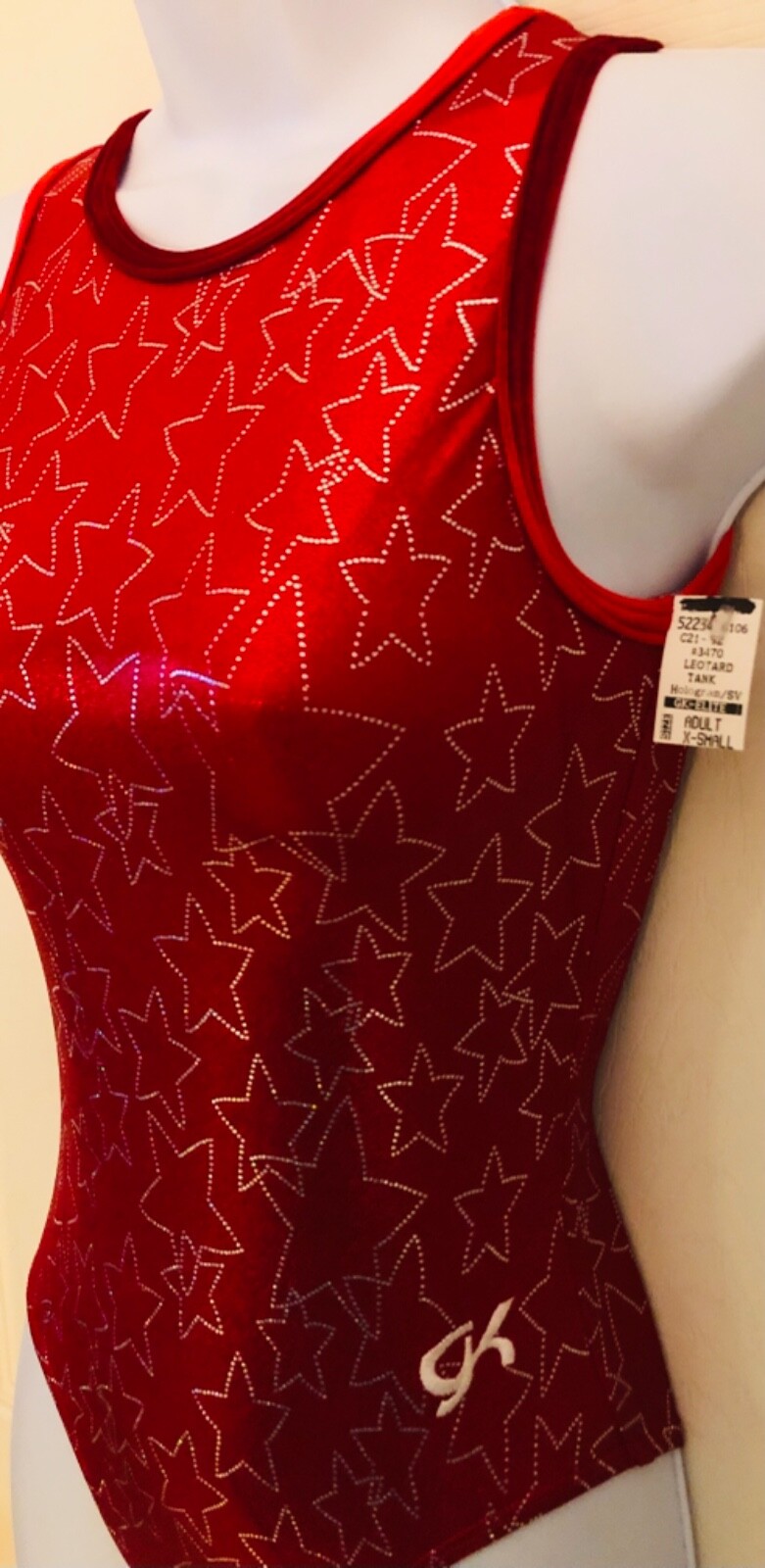 GK RED STAR FOIL PRINT ADULT X-SMALL VELVET GYMNASTIC DANCE TANK LEOTARD Sz AXS