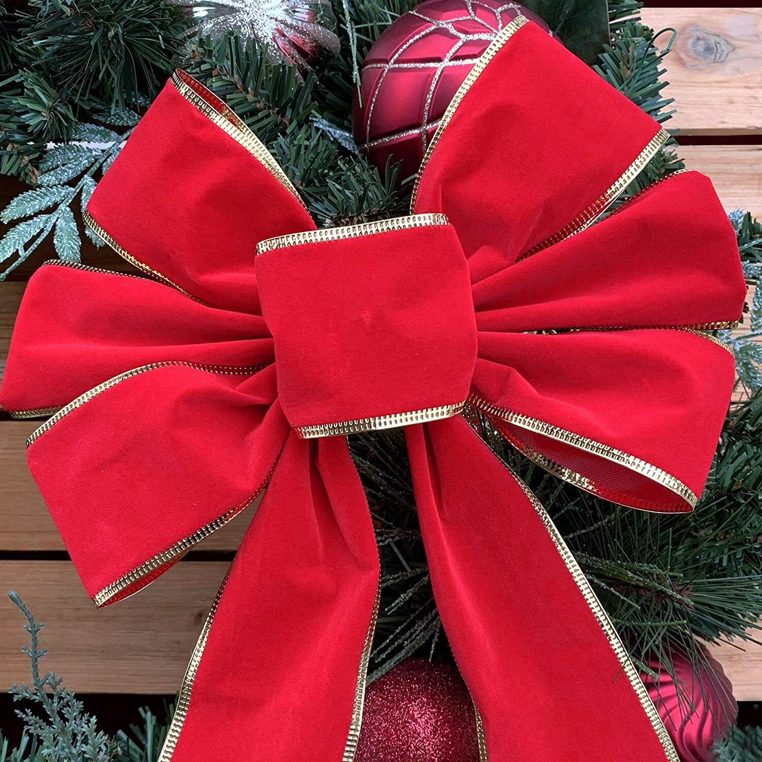 Large Red Velvet Christmas Bow - 10x18 Gold Trim Holiday Tree Top Ribbon Decor