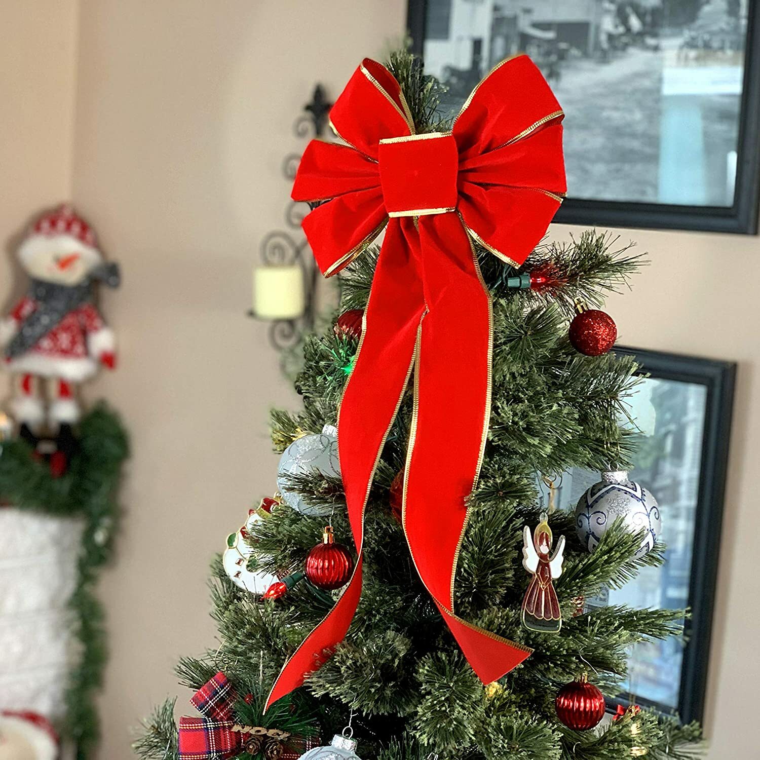 как выглядит Large Red Velvet Christmas Bow - 10"x18" Gold Trim Holiday Tree Top Ribbon Decor фото