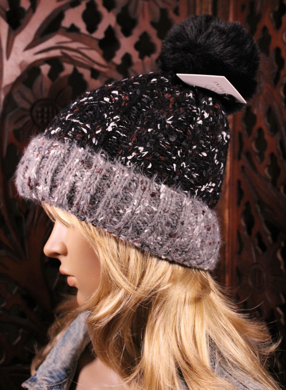 как выглядит Two Tone Beanie Fur Lined Confetti Knit Hat with PomPom Soft and Warm фото