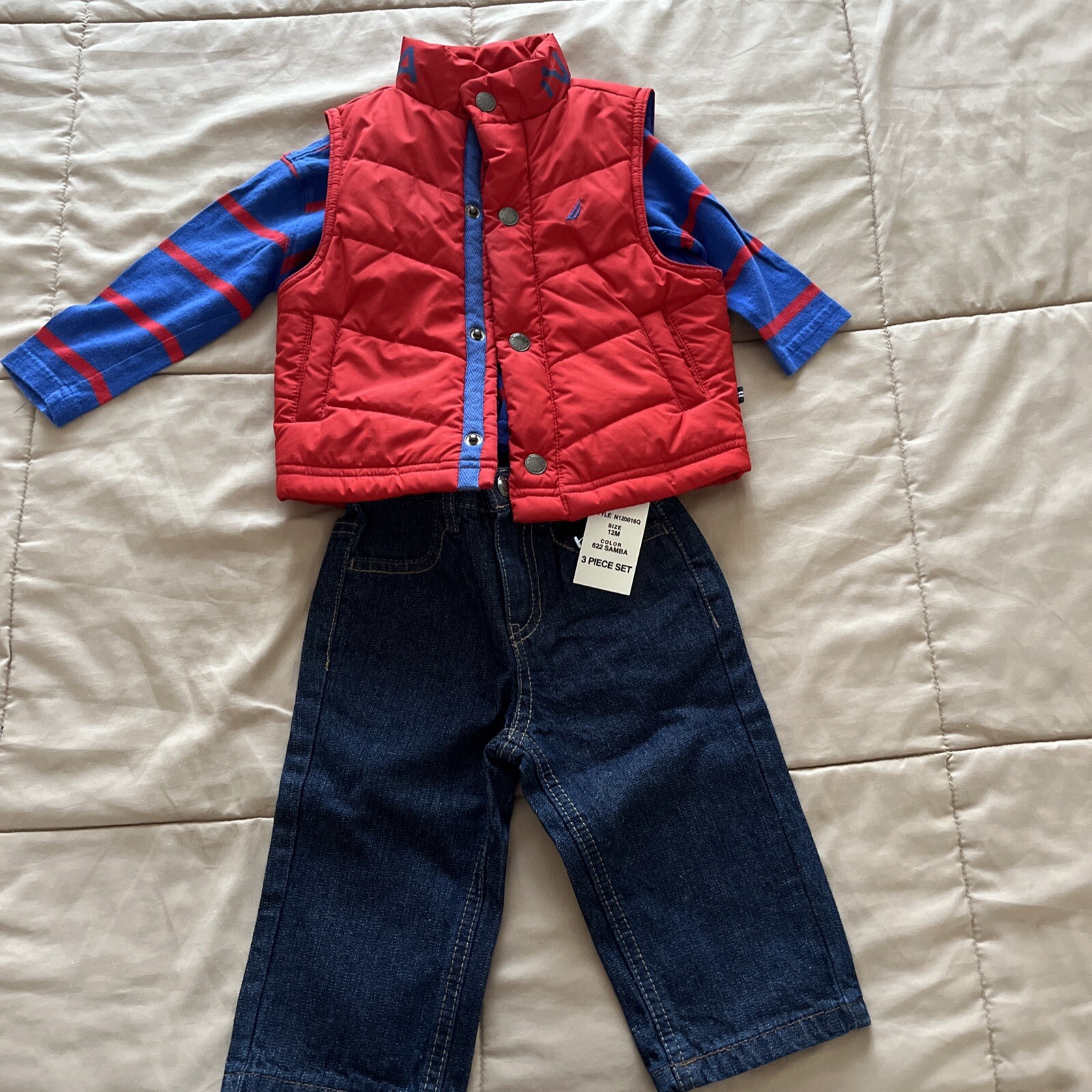 Nautica Boy s Red/ Blue 3piece Set With Vest, NWT Jeans Size 12months