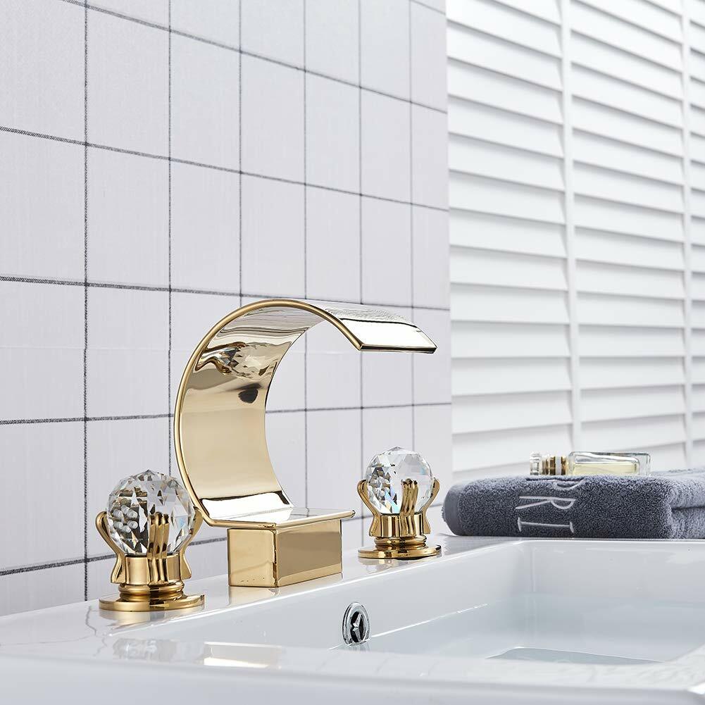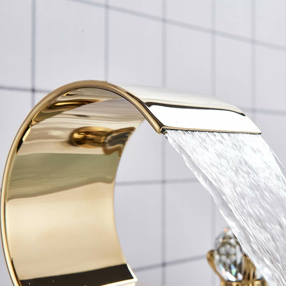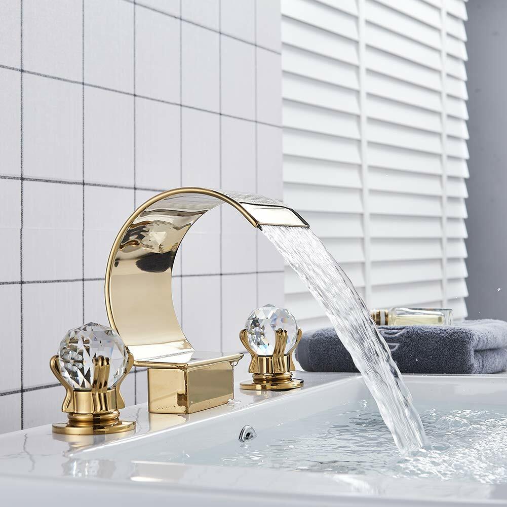 Polish Gold Bathroom Basin Faucet Dual Crystal Handle 3 Hole Waterfall Spout Tap