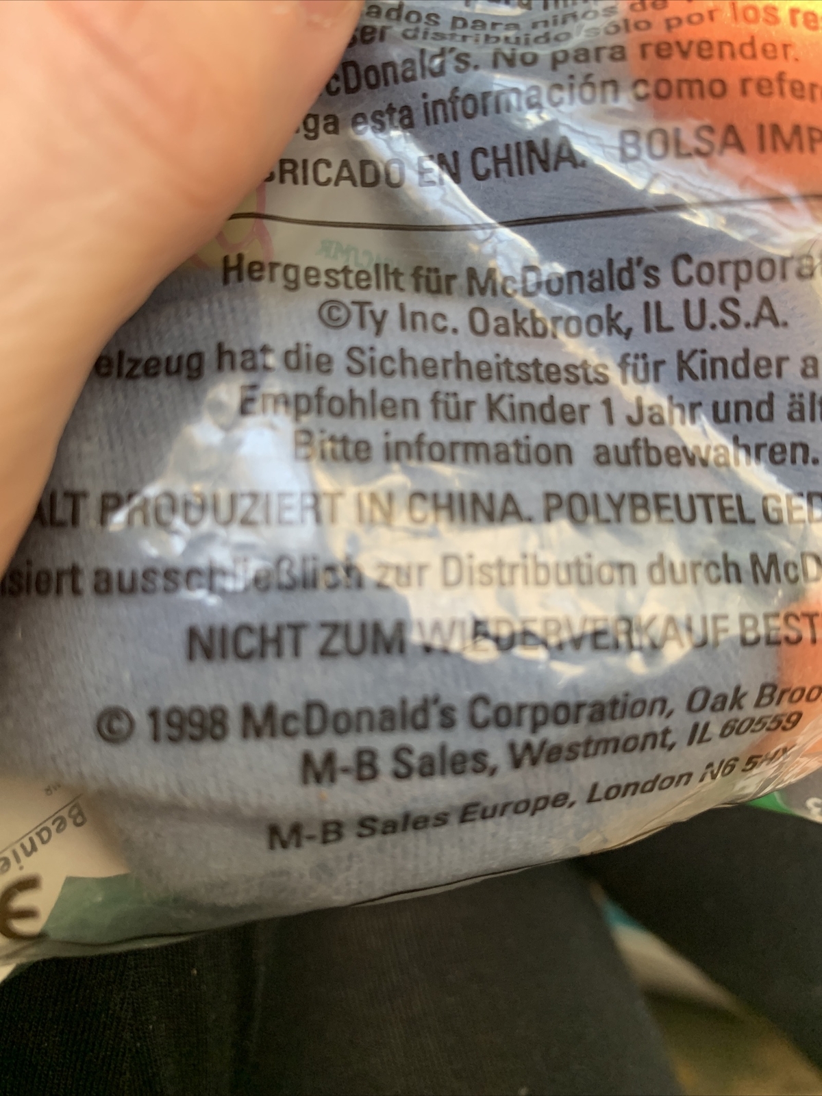 Ty McDonalds Tennie Beanie Baby Scoop Happy meal Toy- Tush Tag 1993, Bag 1998