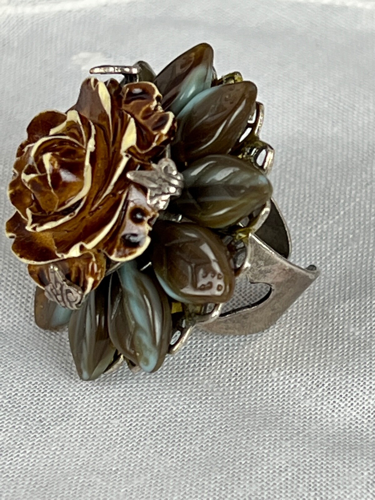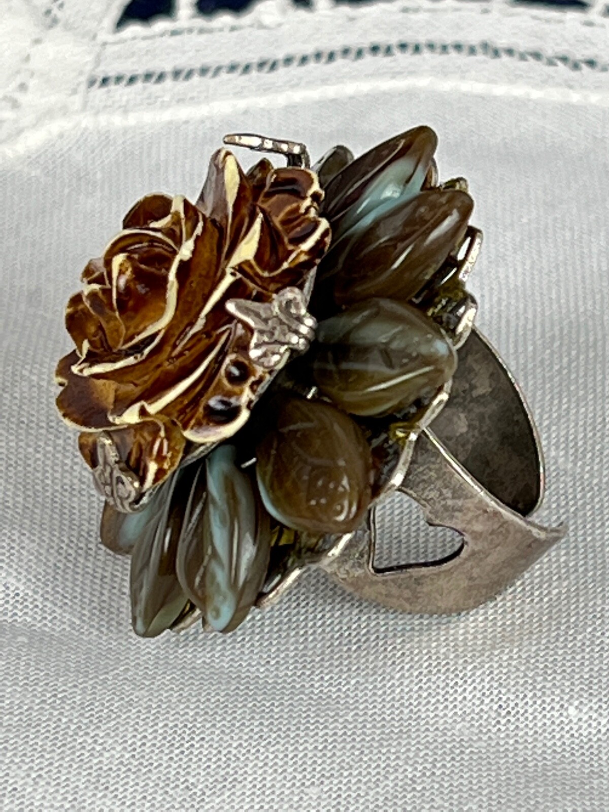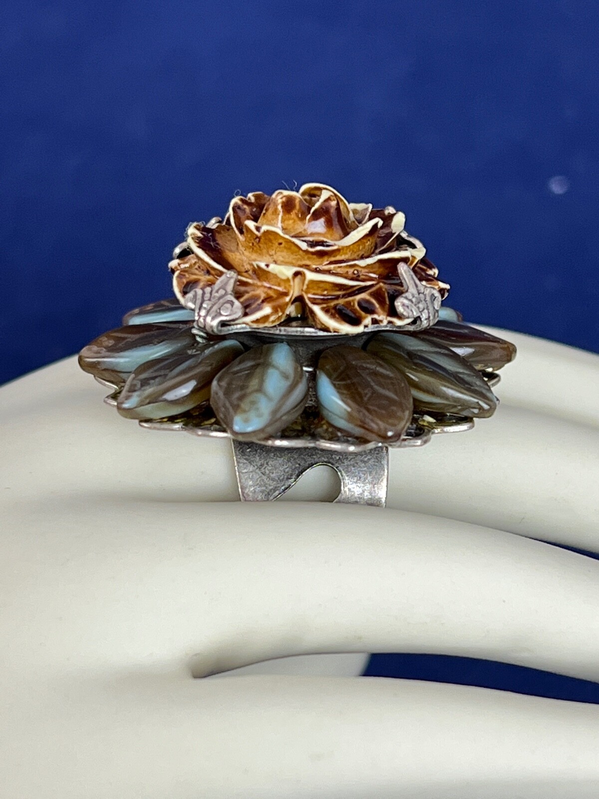 Art Ceramic Lucite 3D Brown Flower Ring Silver Tone Setting Adjustable Sizing