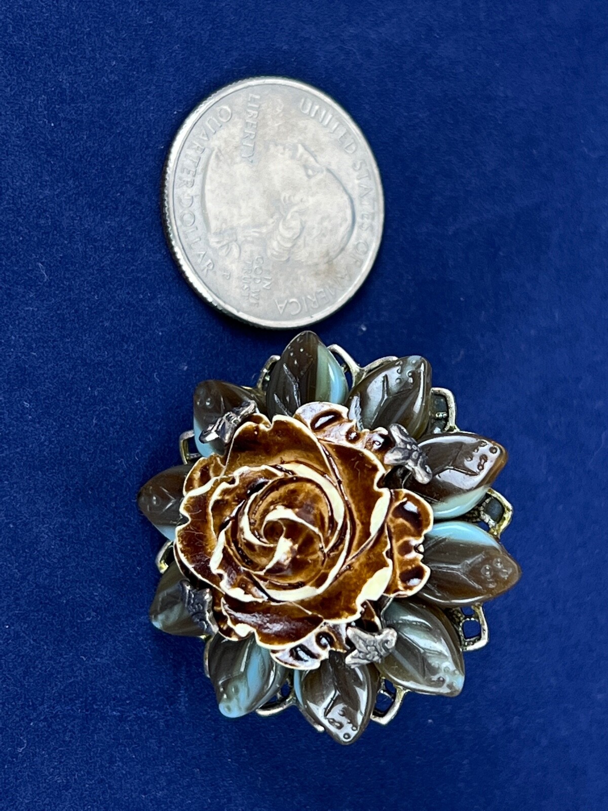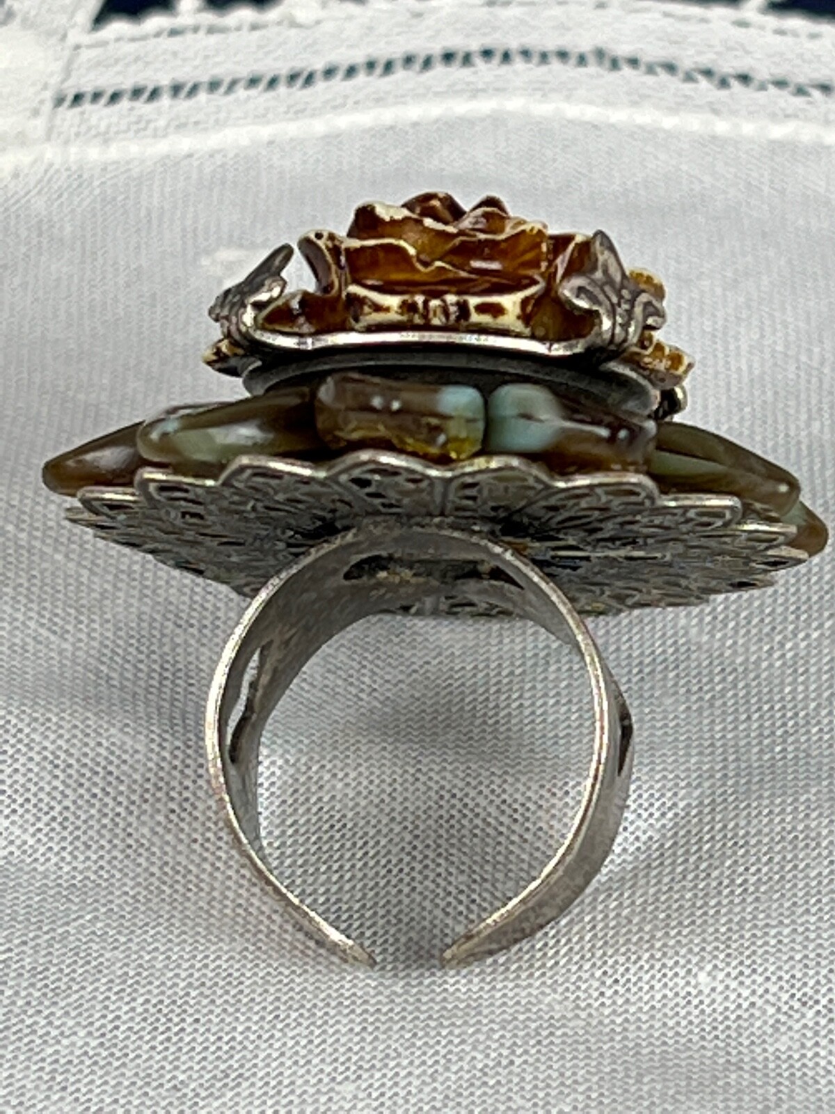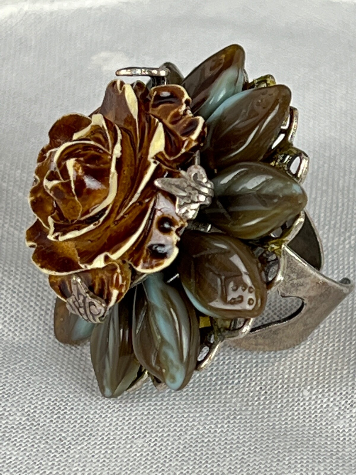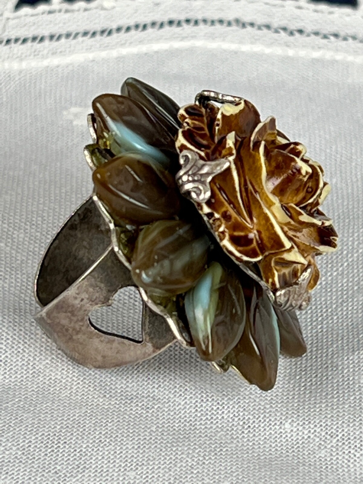 Art Ceramic Lucite 3D Brown Flower Ring Silver Tone Setting Adjustable Sizing