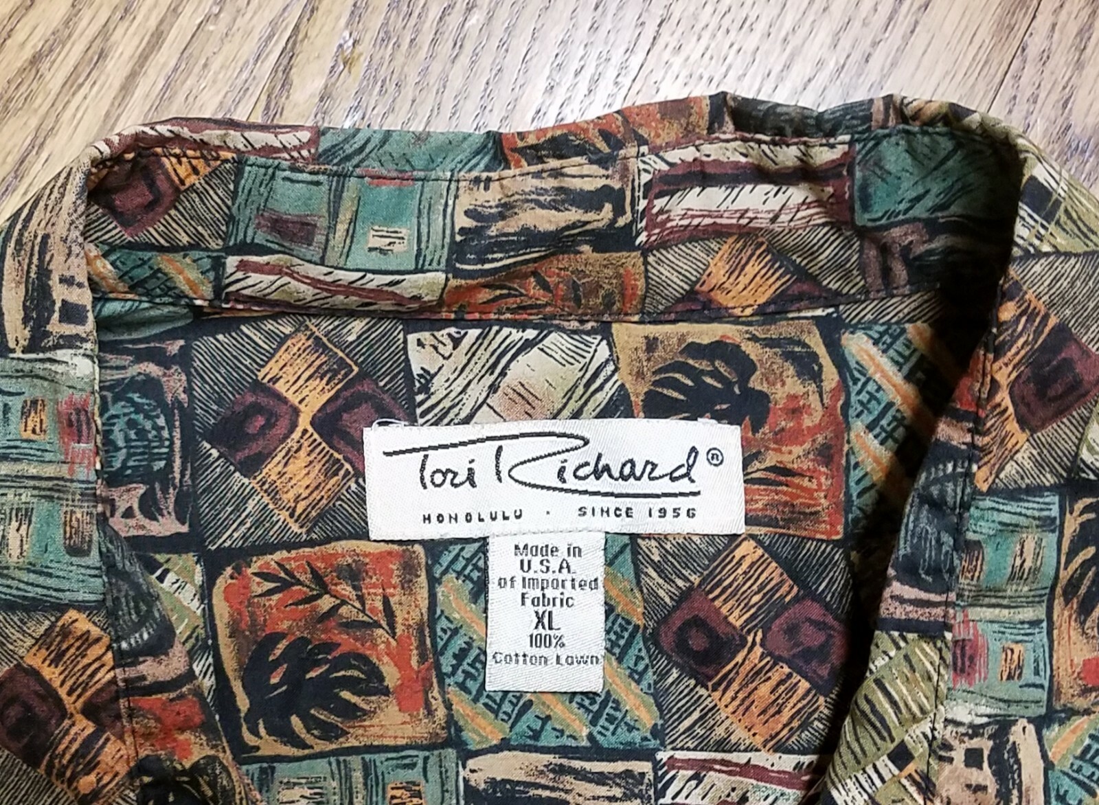 XL Vintage TORI RICHARD Honolulu Hawaii ALOHA SHIRT Tribal Leaf Squares Cotton