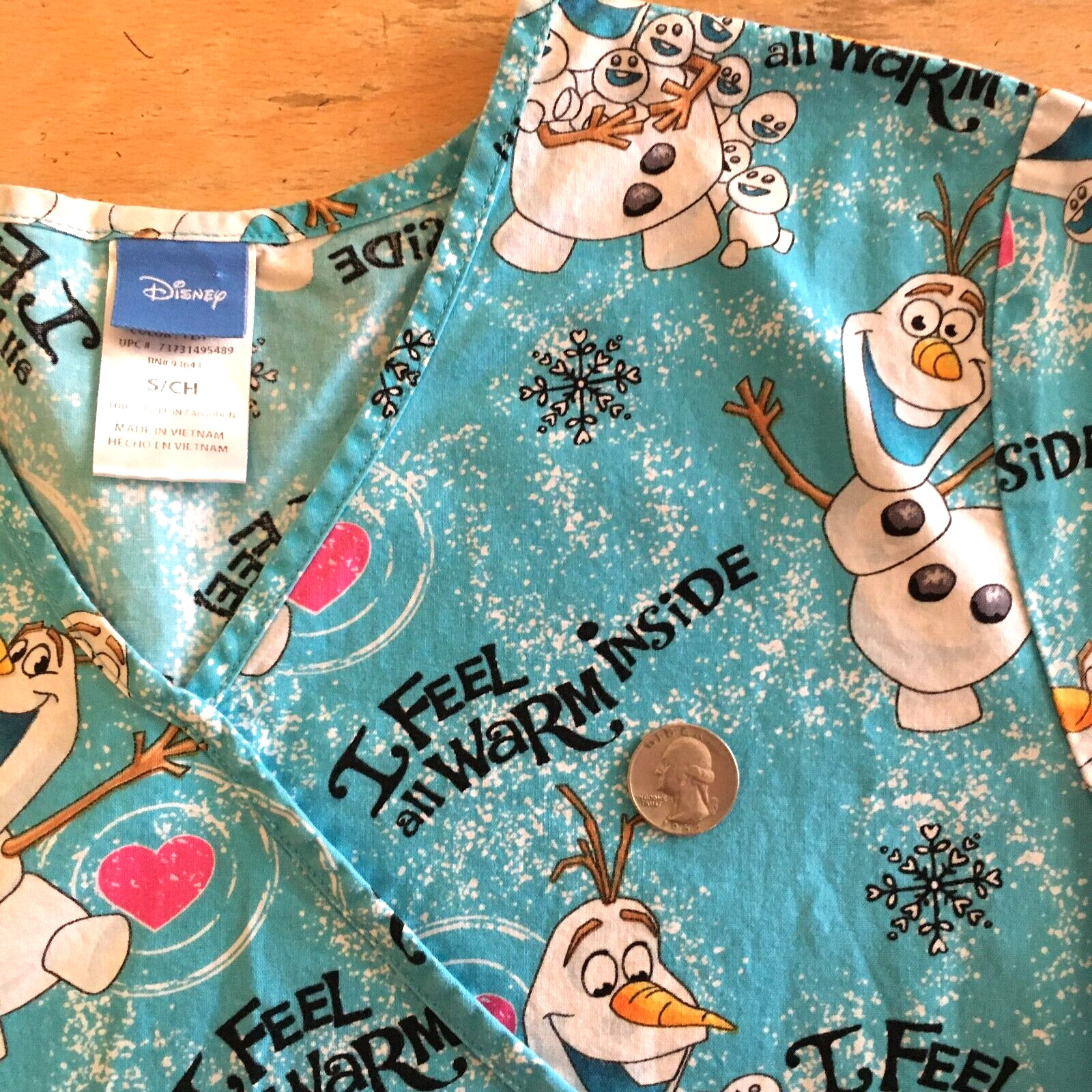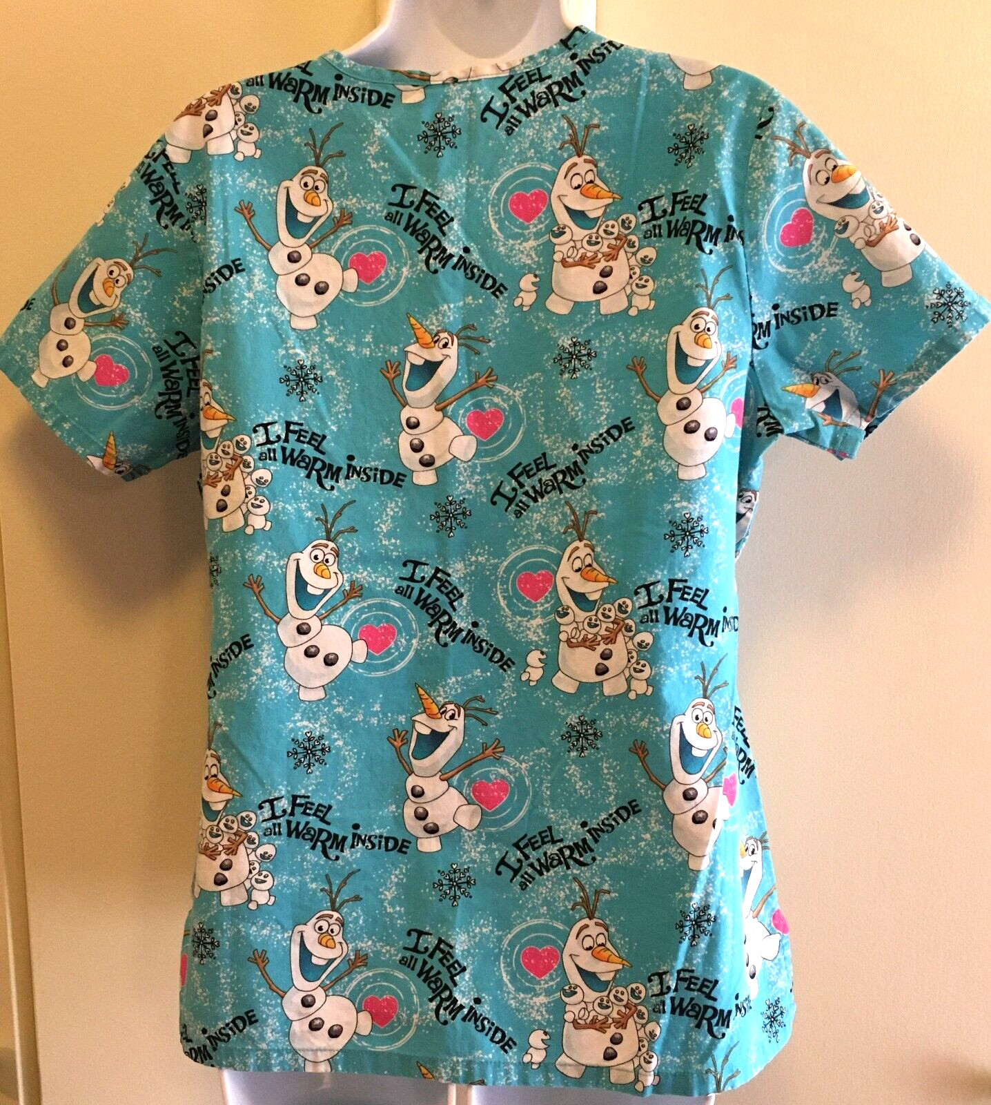 Disney Sz. S Scrub Top FROZEN OLOF SNOWMAN I FEEL ALL WARM INSIDE Cotton EUC