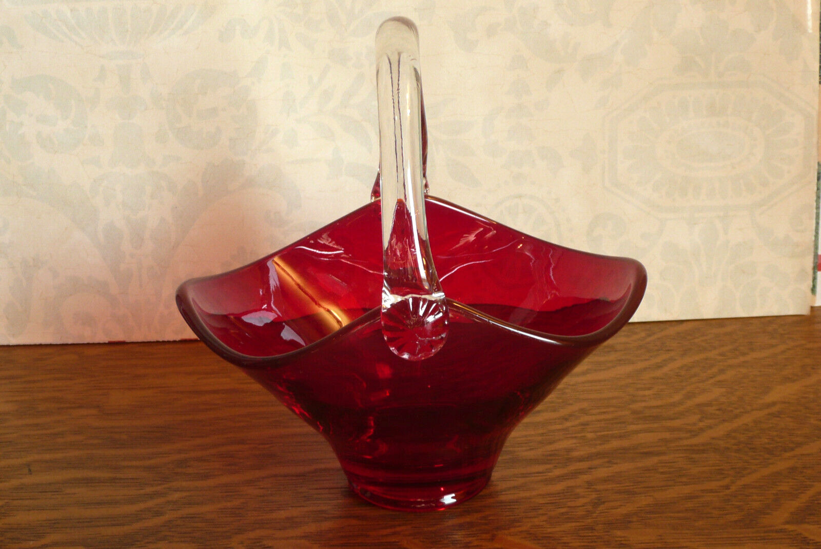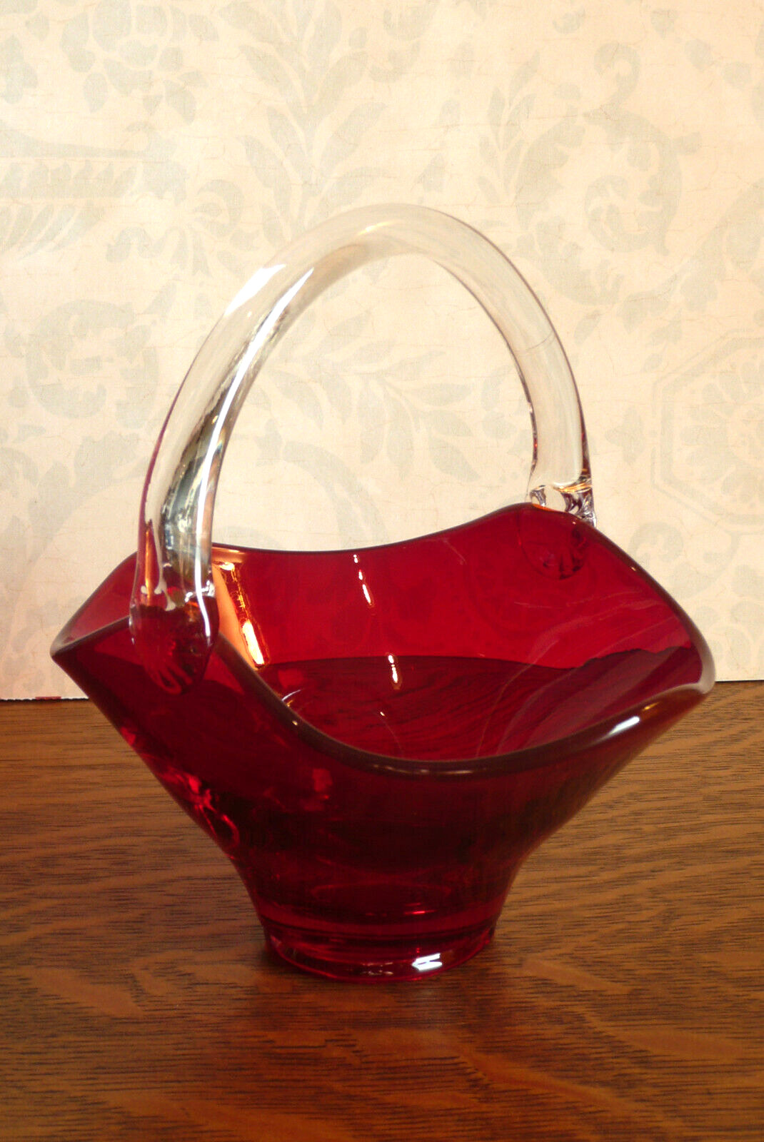 Mid Century Ruby Red Glass Basket / Candy Dish 7 Tall MCM