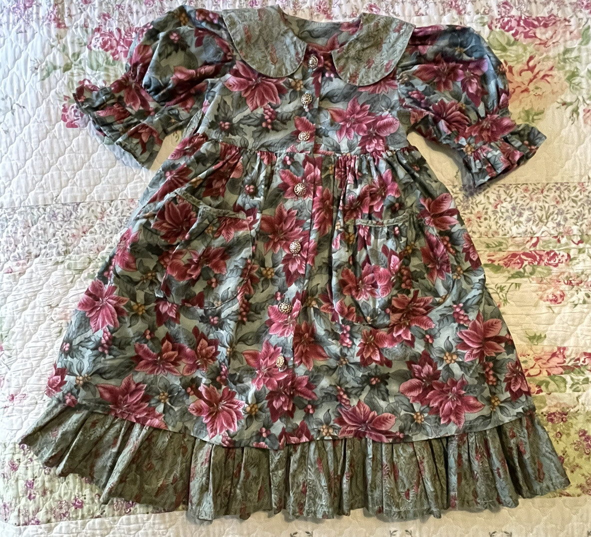 Vintage COTTON COLLECTION Christmas Poinsettia Ruffle Tie in Back Dress Girls 6