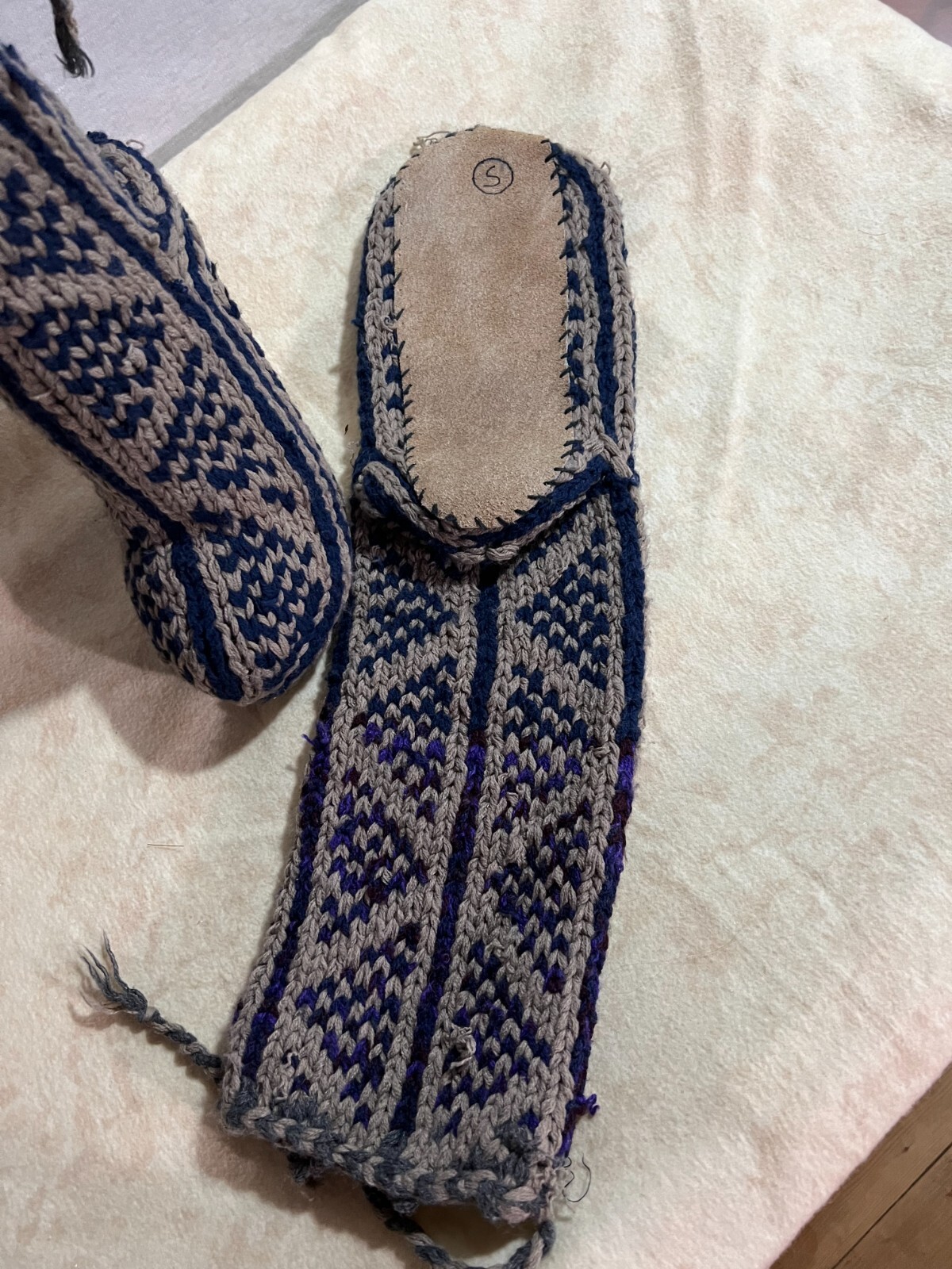 как выглядит NWOT MUK LUKS House Cabin Slippers Socks Handmade Sand/Tan Purple Suede Sole S фото