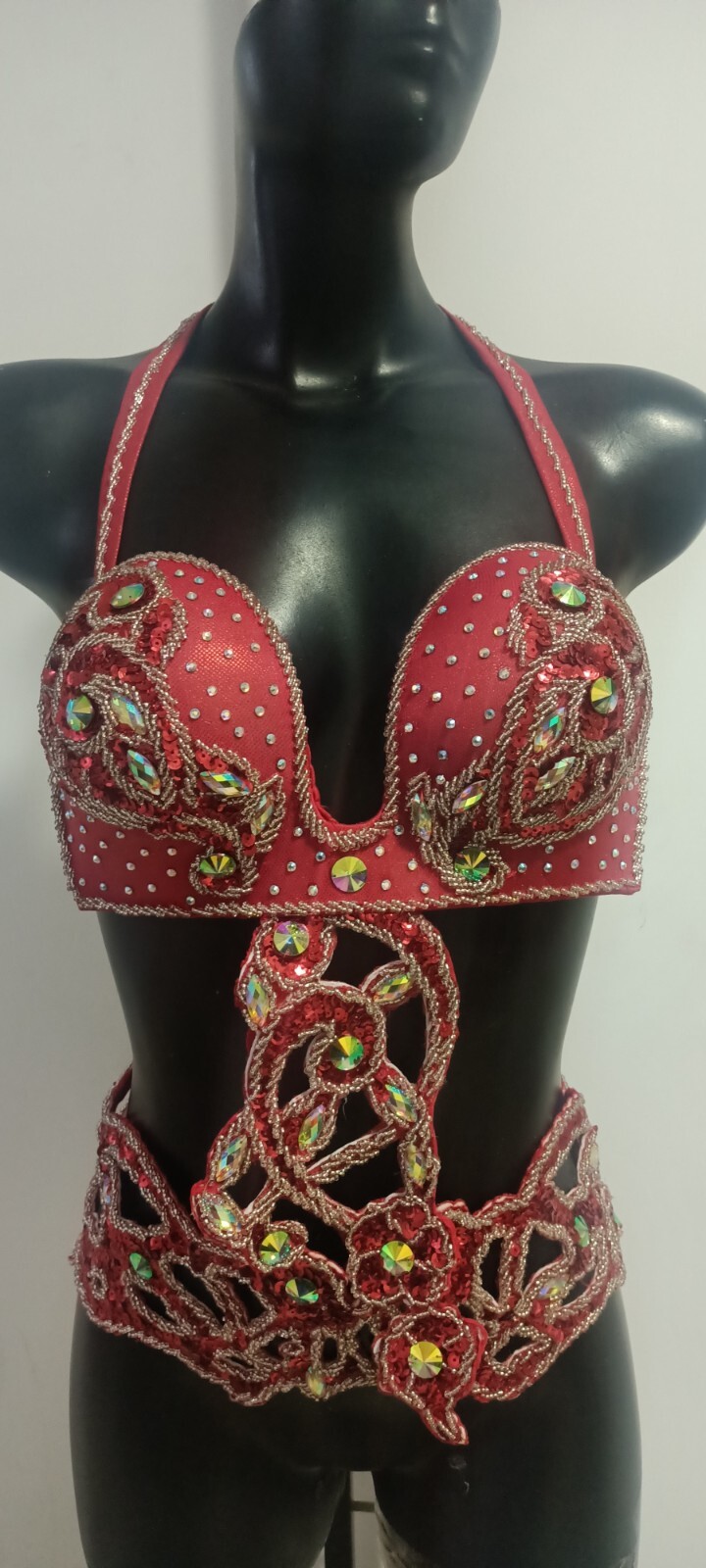 Egyptian Belly Dance Costume bra Belt Professional Dancing Red Silver Beads