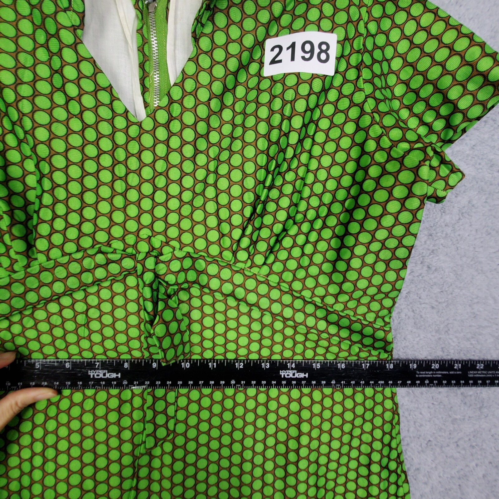 Vtg 60s Womens Blouse Size M L Green Mod V Neck Short Sleeves Polka Dot Zip Bow