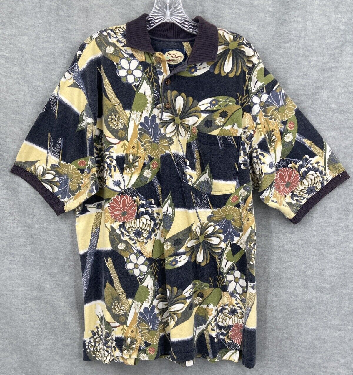 Tommy Bahama Polo Shirt Men's Medium Blue Island Print Short Sleeve 100 Cotton
