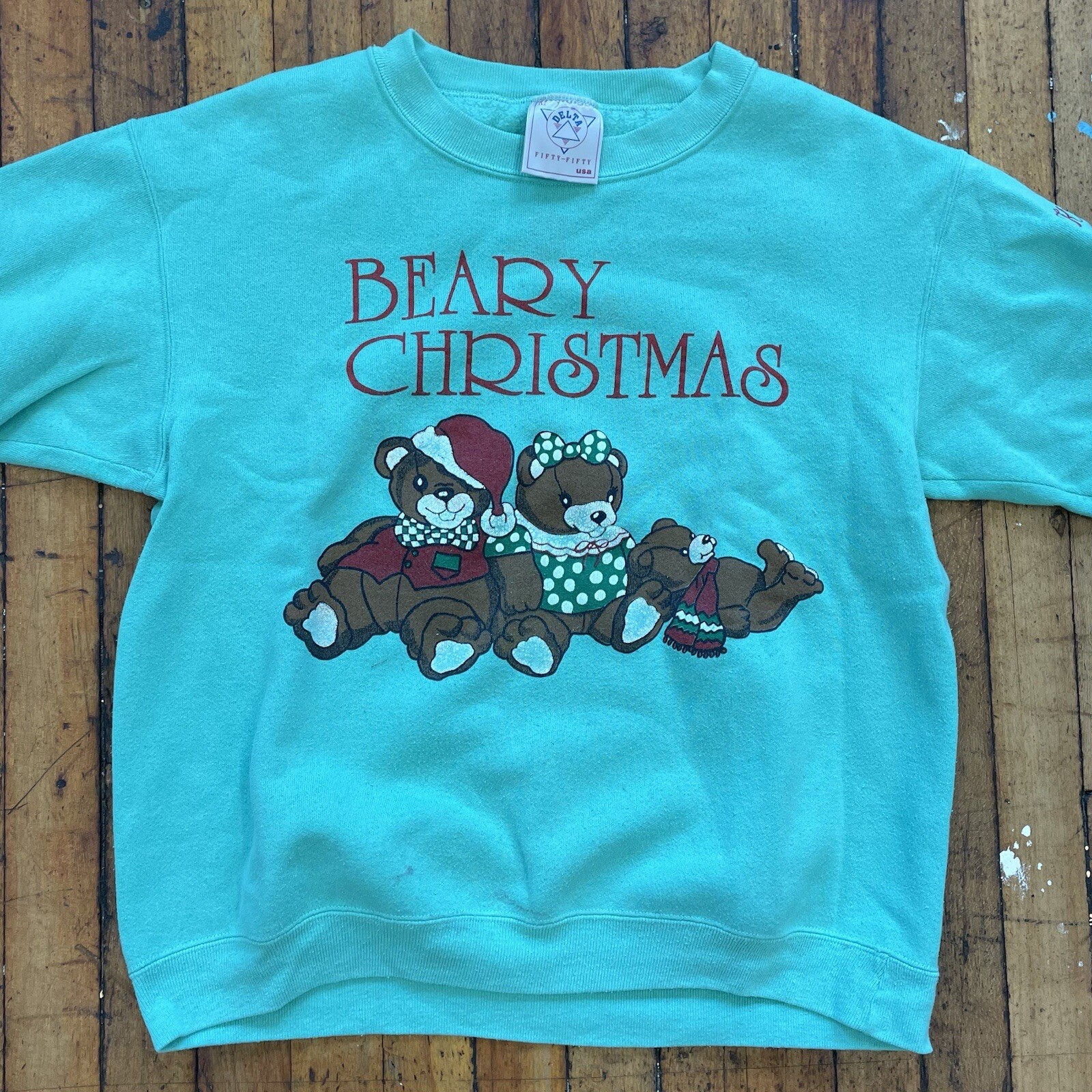 как выглядит Vintage 80s TEDDY BEAR CHRISTMAS Medium Teal Holiday Pullover Sweatshirt фото