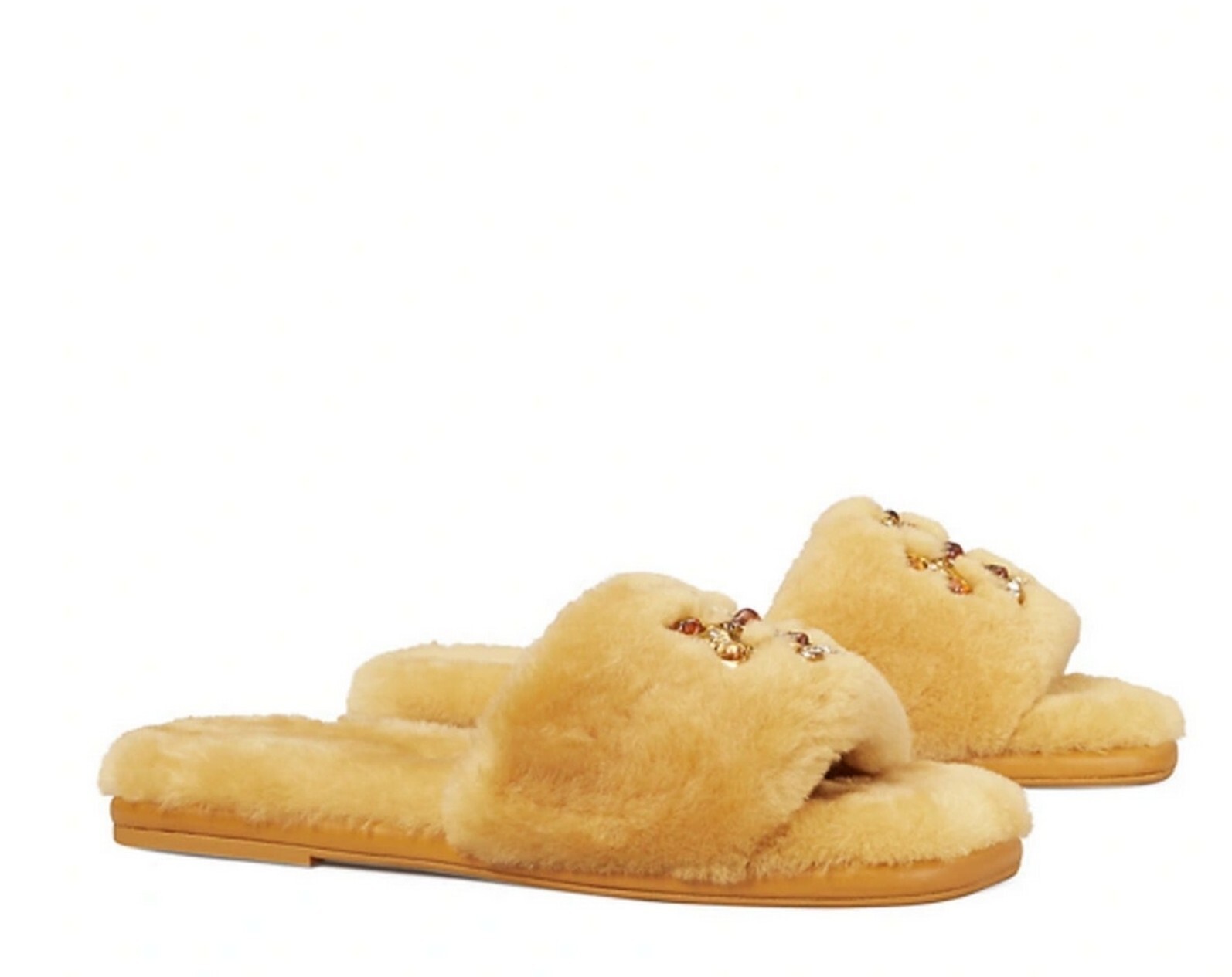 TORY BURCH 298 JEWELED SHEARLING SLIDE SLIPPER SANDAL HONEY DOUBLE-T LOGO US5.5