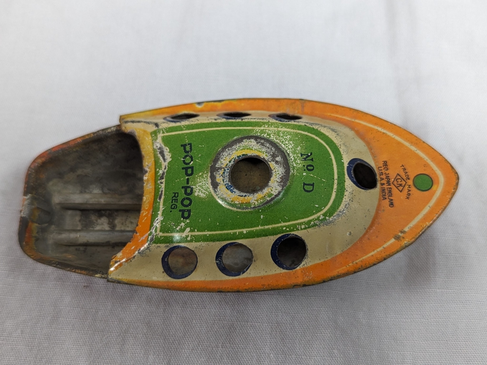 Vtg C.K. Trademark Japan Tin Litho Pop-Pop Candle Boat Toy Orange Green 4.25