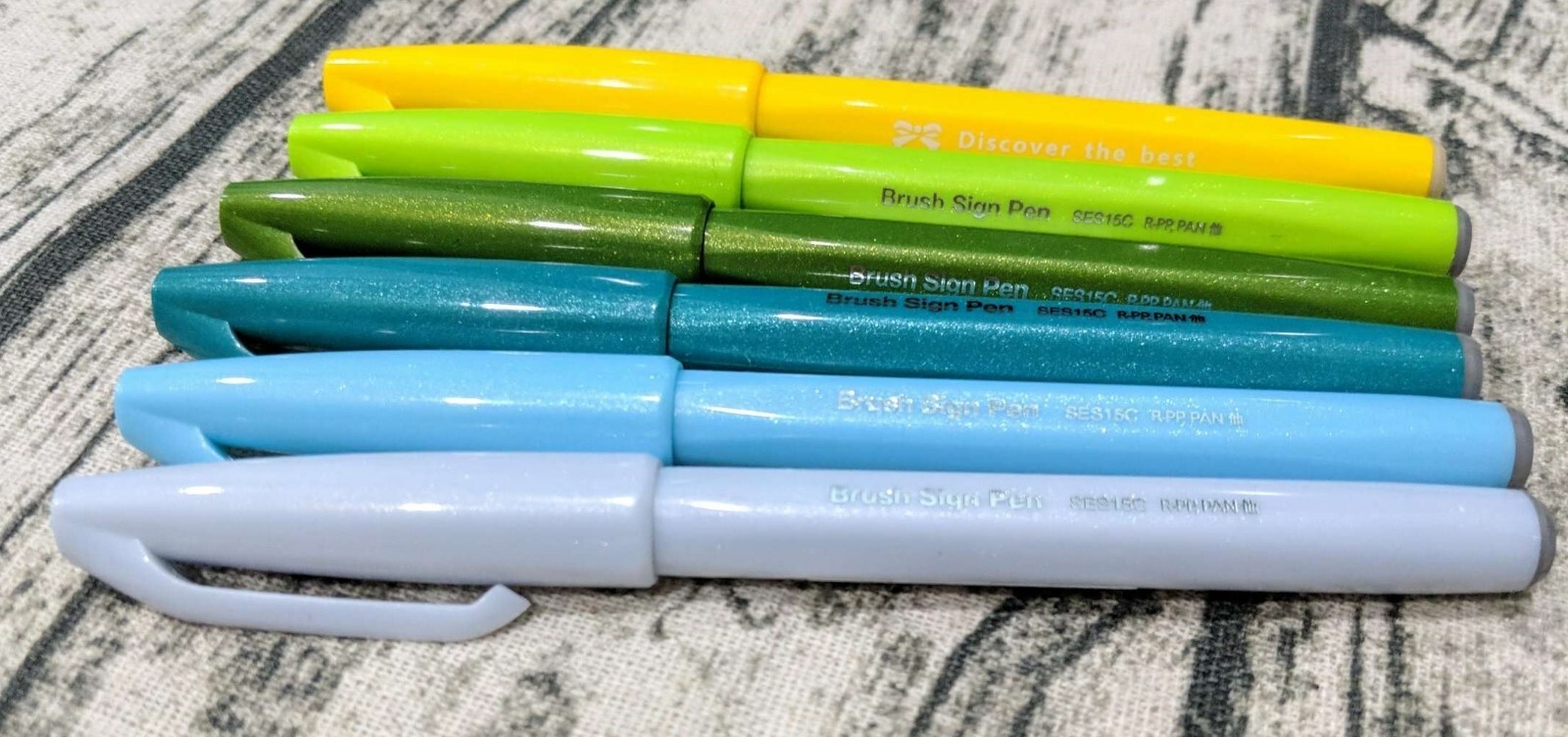 6x Pentel Fude Touch Brush Sign Pens Pastel Color Olive Green Yellow Pale Blue