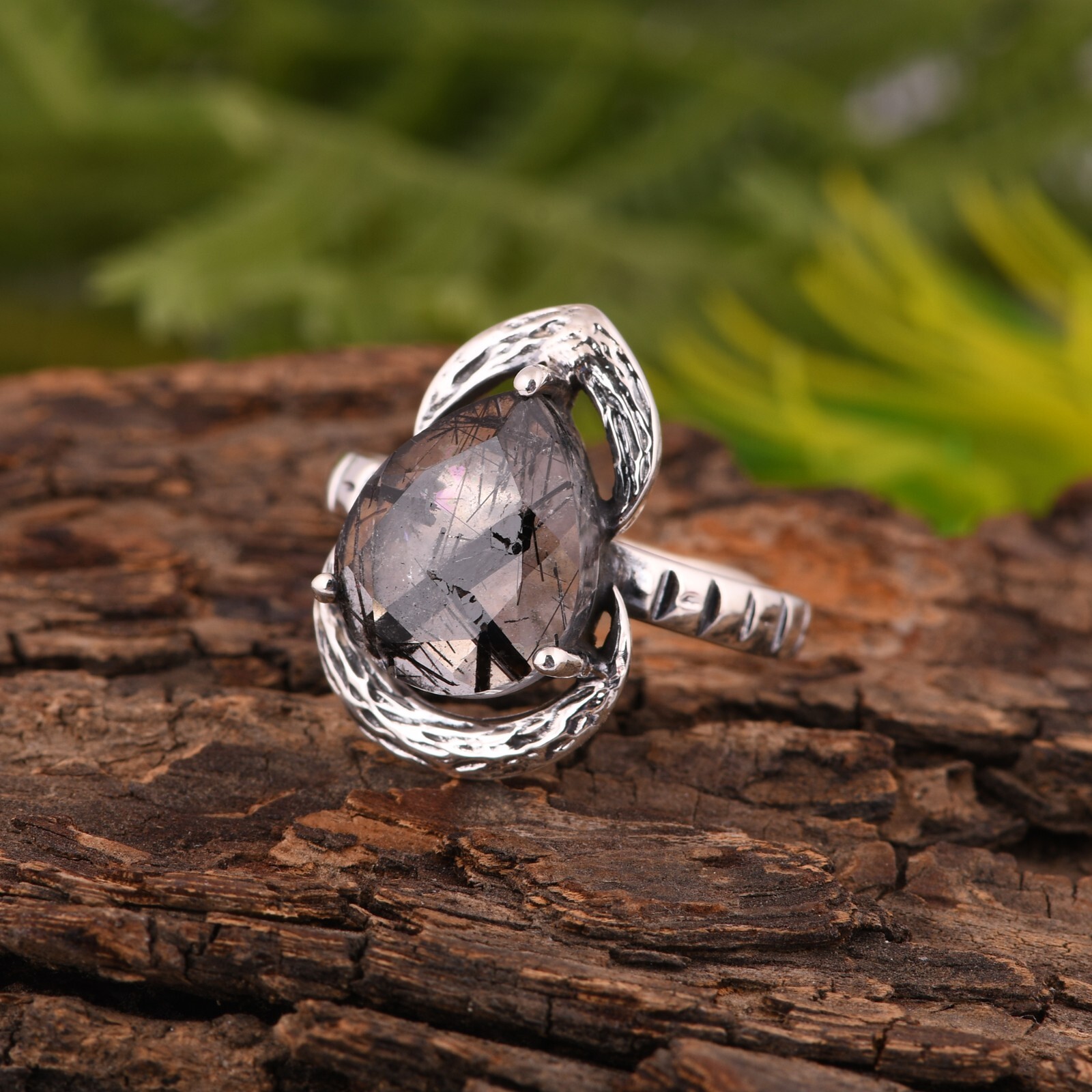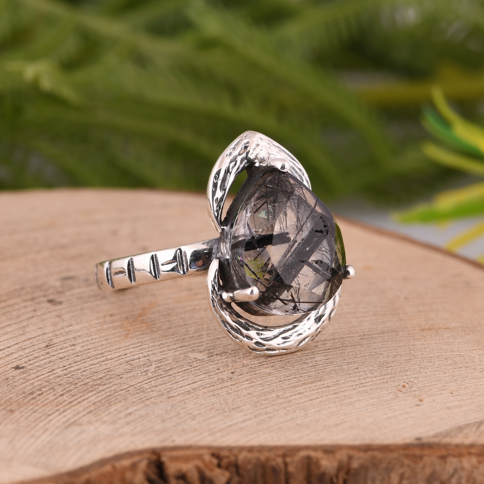 как выглядит Natural Black Rutile Quartz Sterling Silver Ring Boho Handcrafted Ring Jewelry фото
