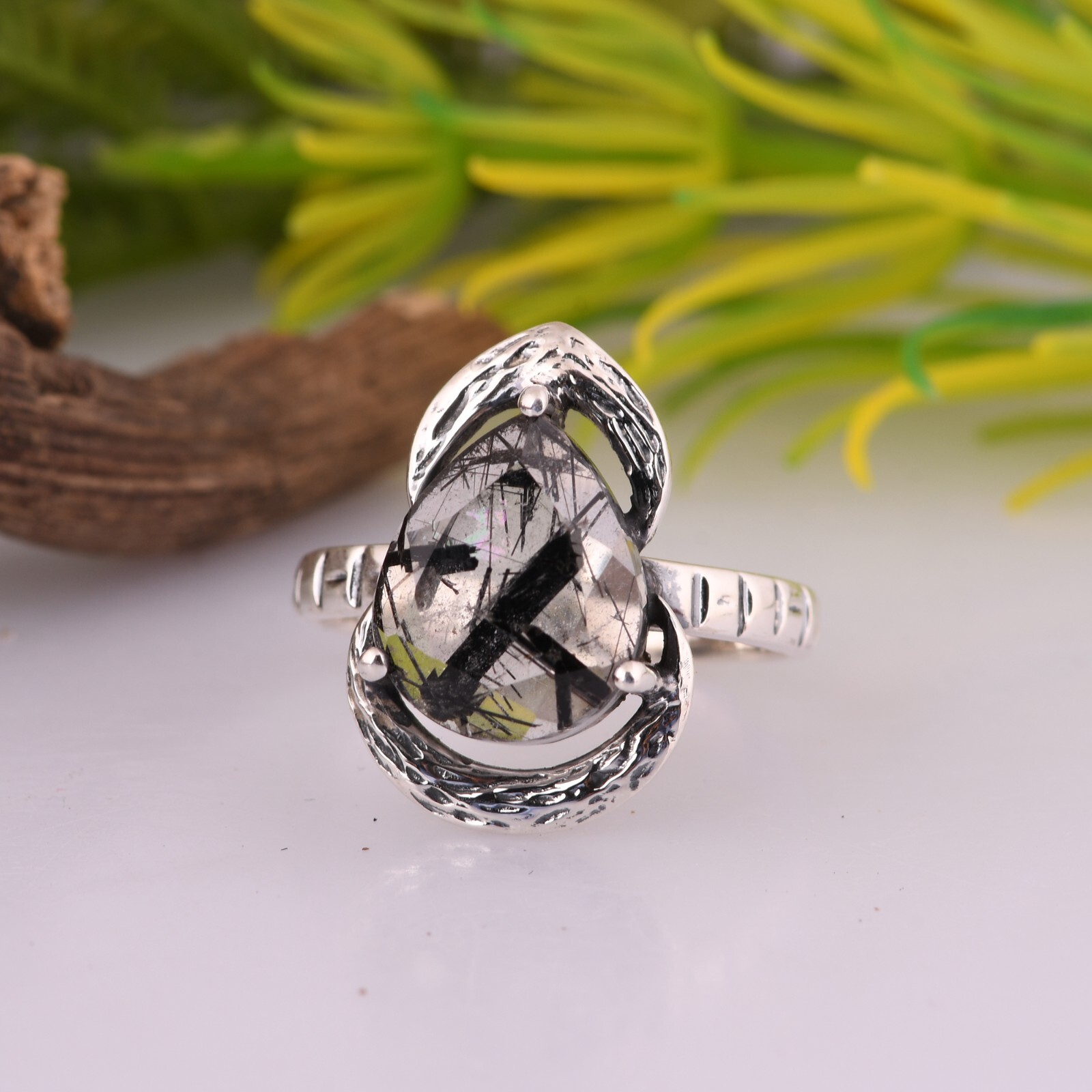 Natural Black Rutile Quartz Sterling Silver Ring Boho Handcrafted Ring Jewelry