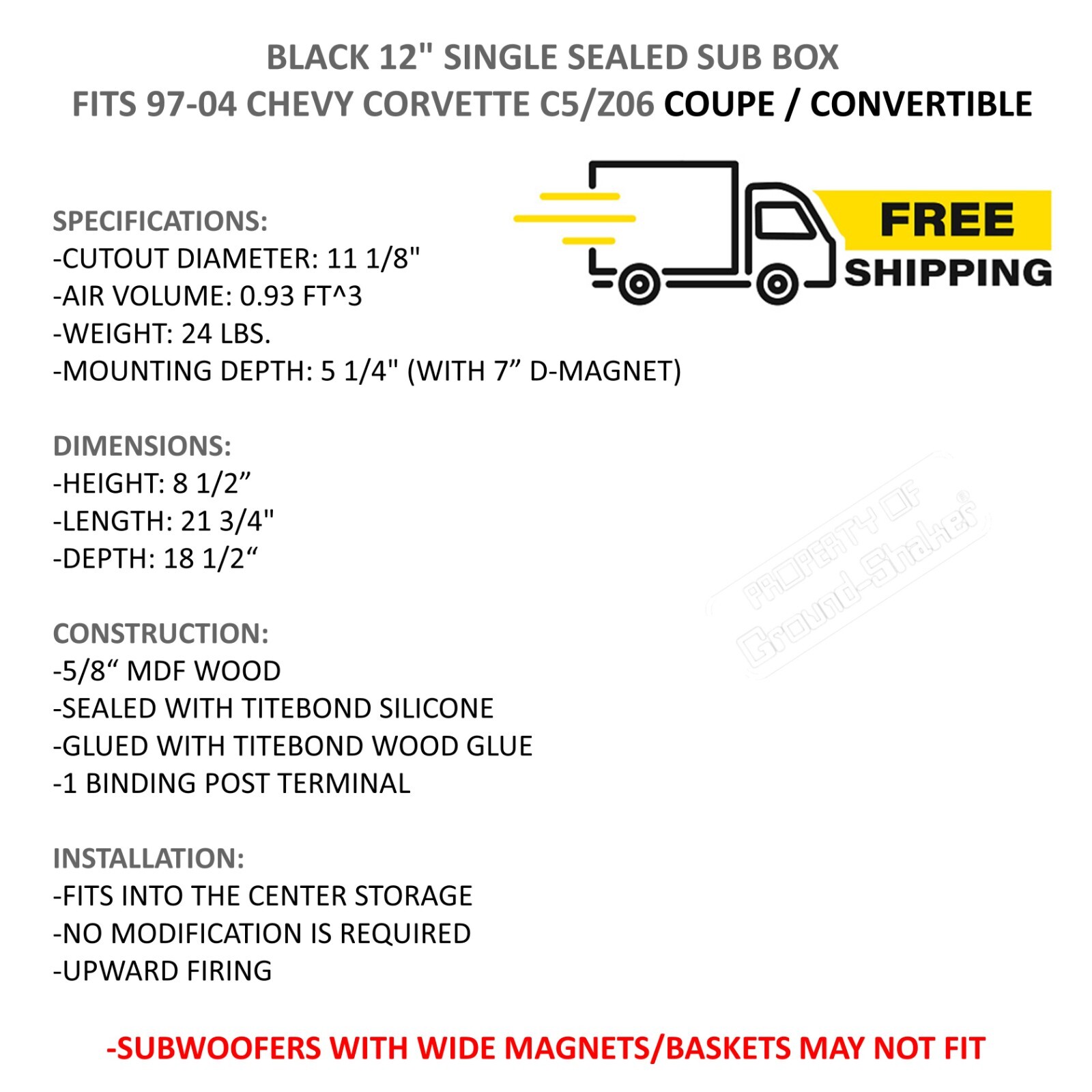 1997-2004 Chevy Corvette C5/Z06 12 Single L7T Sub Box Subwoofer Enclosure