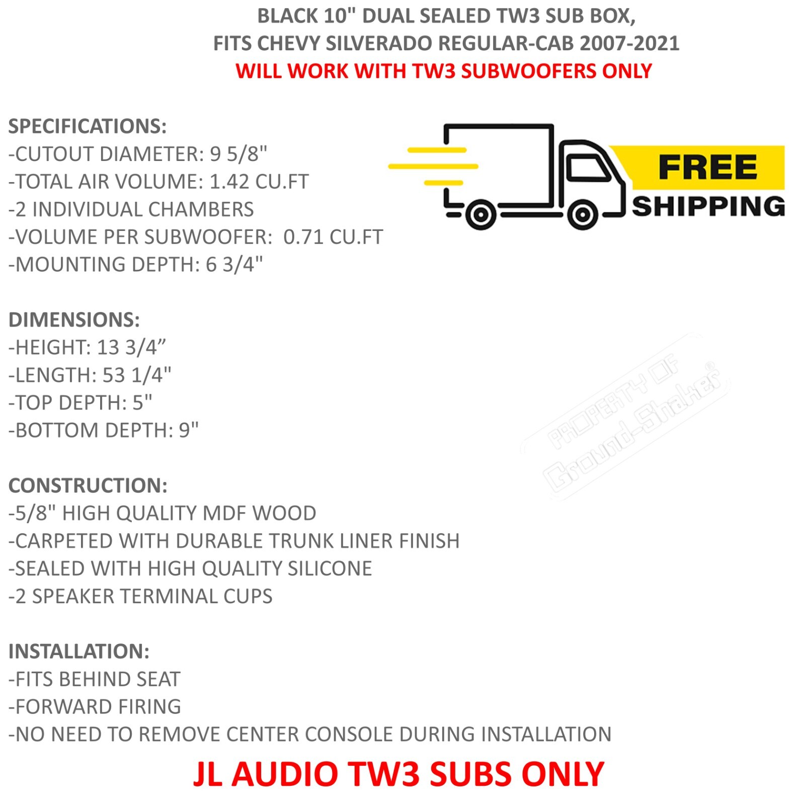 Regular Cab / Single Cab Truck 10 Dual Sealed TW3 Sub Box Subwoofer Enclosure