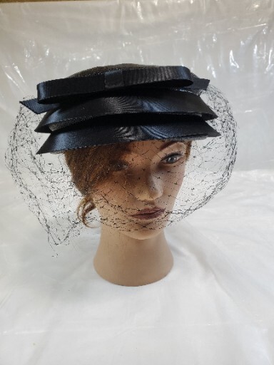 60's Clover Lane Black Satin Layered Pillbox Hat Matching Veil Sz 22 1/2 EUC