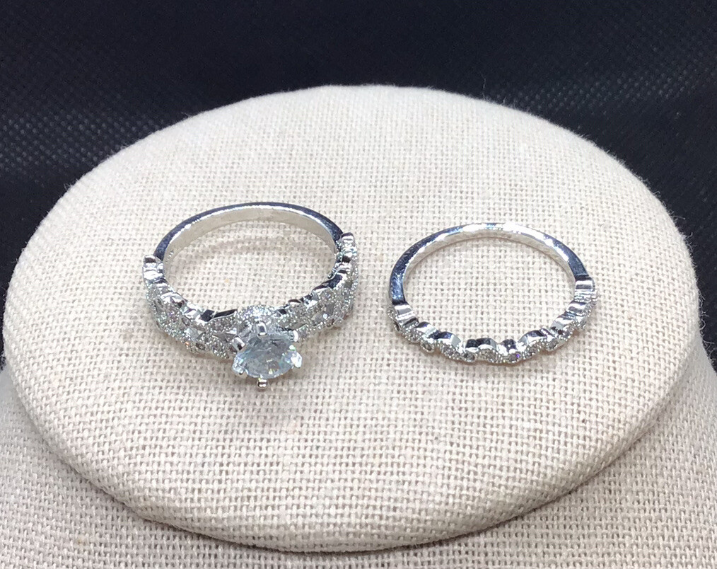 Sterling Silver 925 Unique Leaves Design Cz Wedding Ring Set Sz 7.75 V644