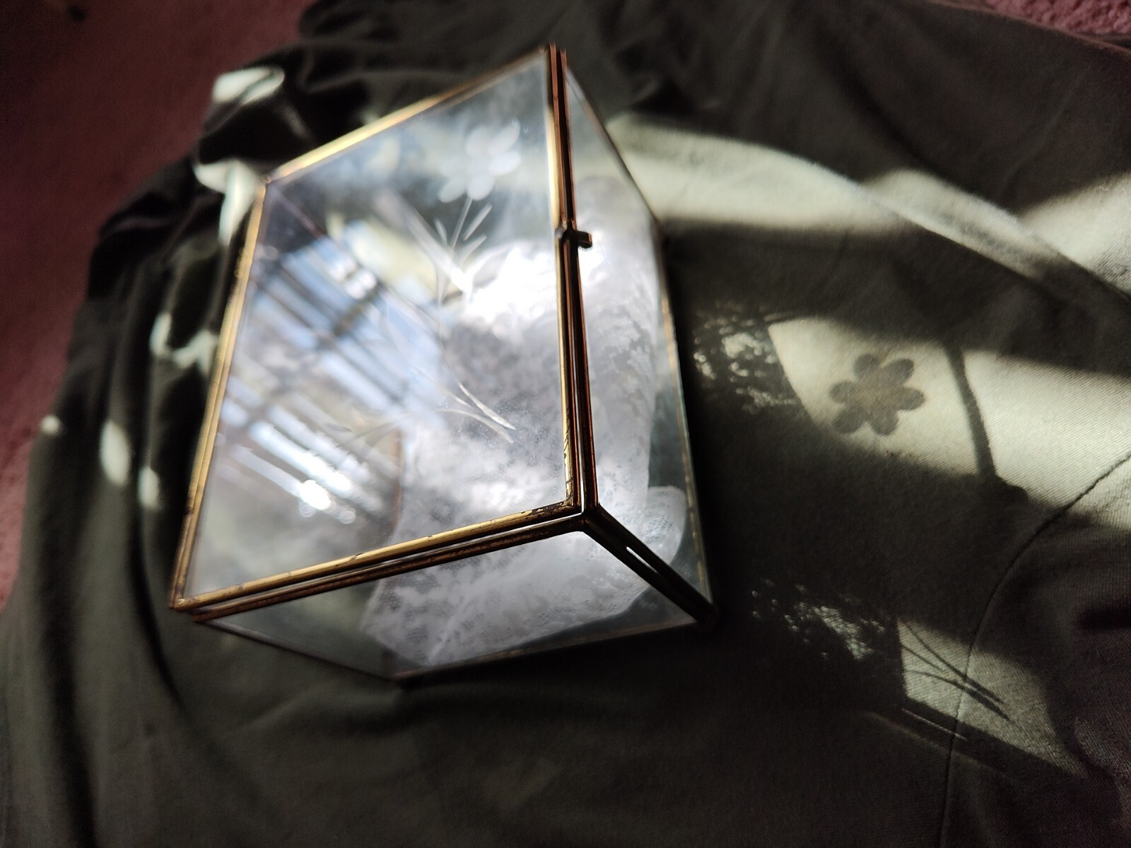 • Vintage Brass / Etched Glass Jewelry Trinket Curio Box Floral Design 7x5x4 Size