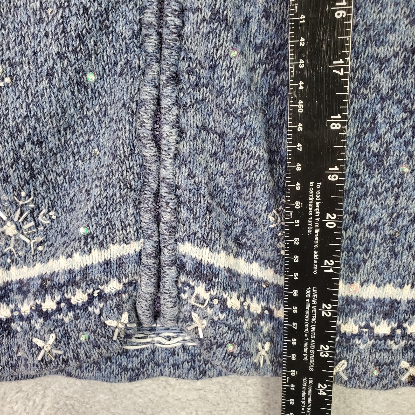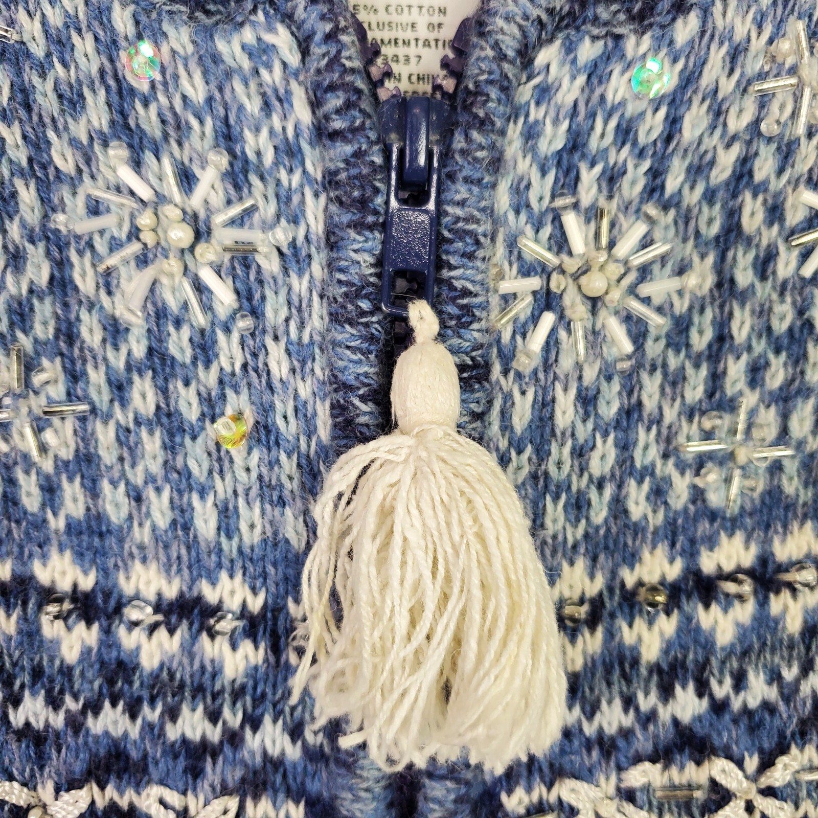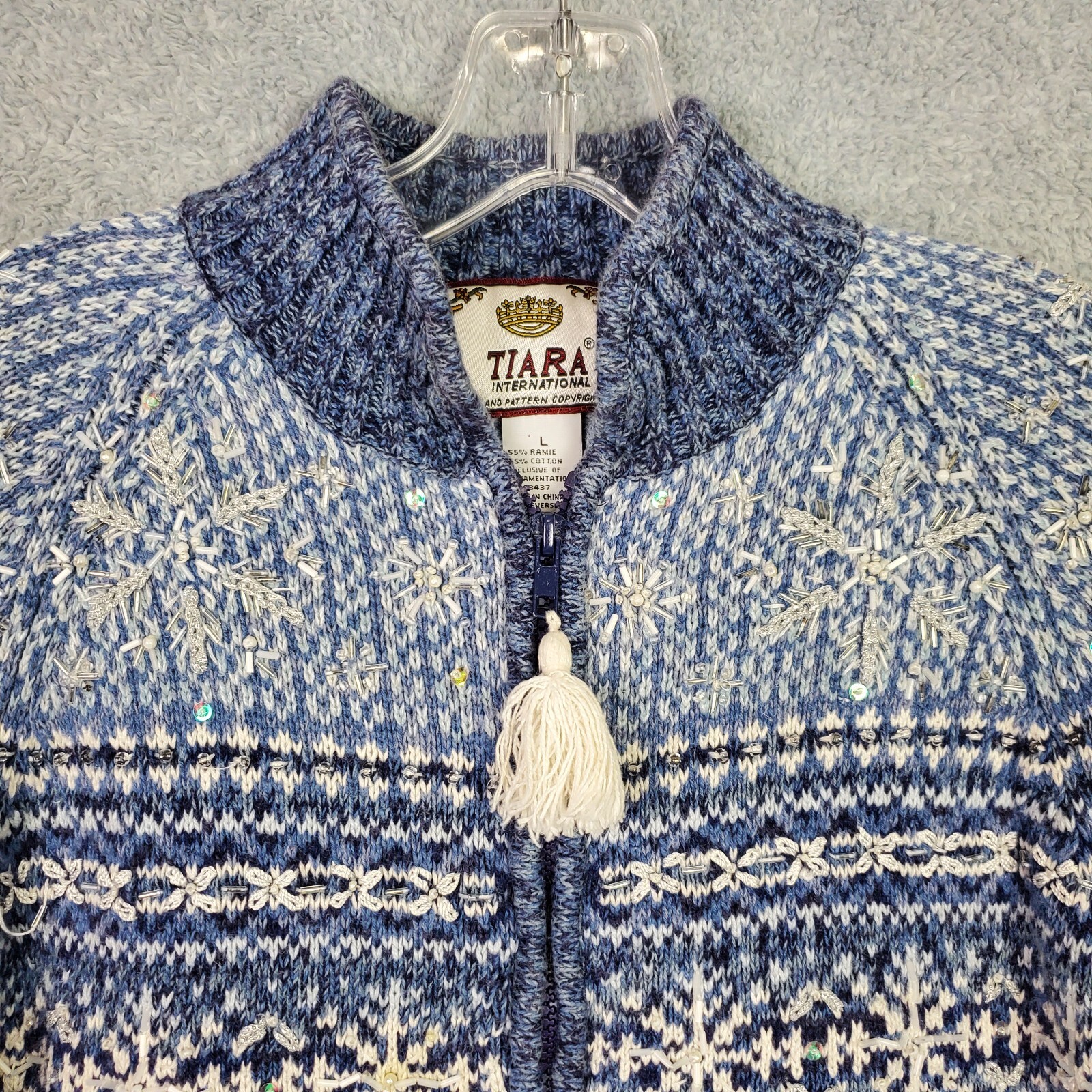 Vtg Tiara International Womens Cardigan L Blue Fair Isle Beaded Crhistmas Zip