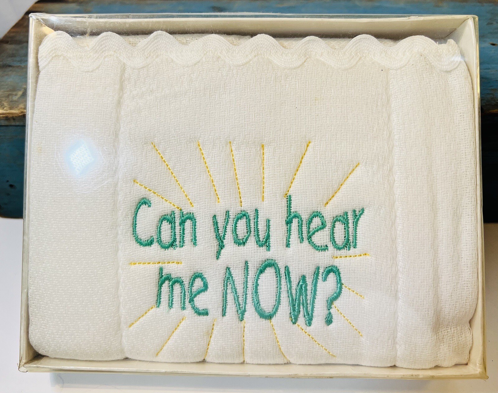 Vtg Ribbed White Cloth Diaper W/Wording Can You Hear Me Now Yellow Rays NOS
