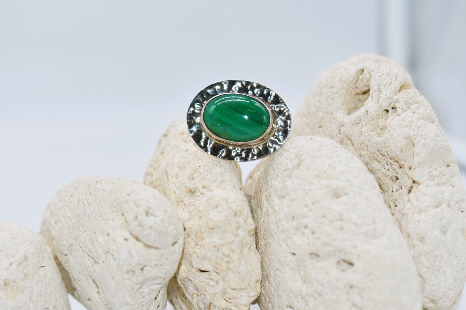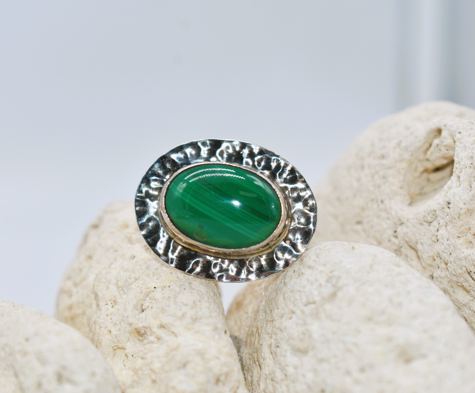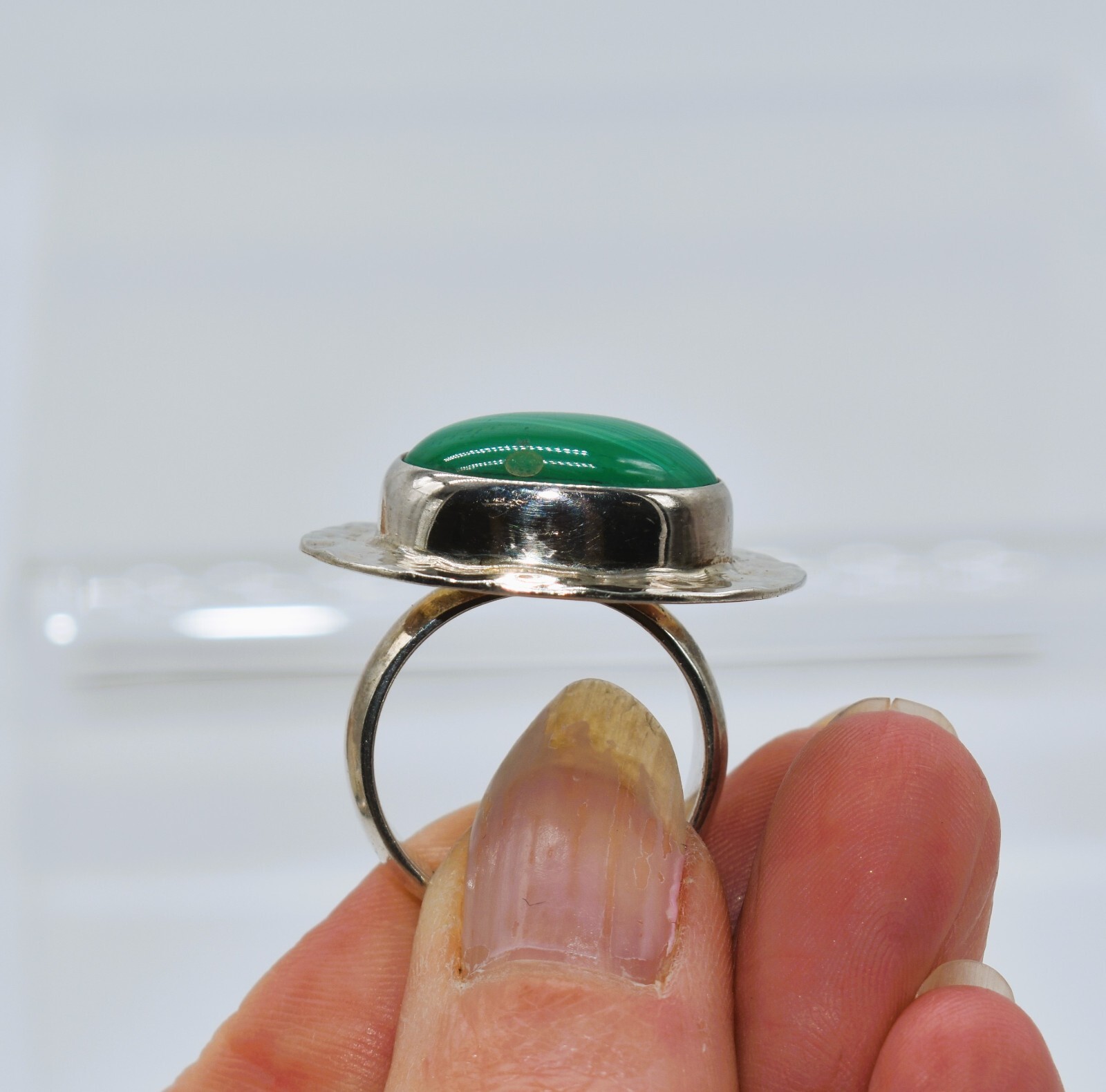 Malachite Hammered Sterling Silver Mexican Modernist Ring Size 8