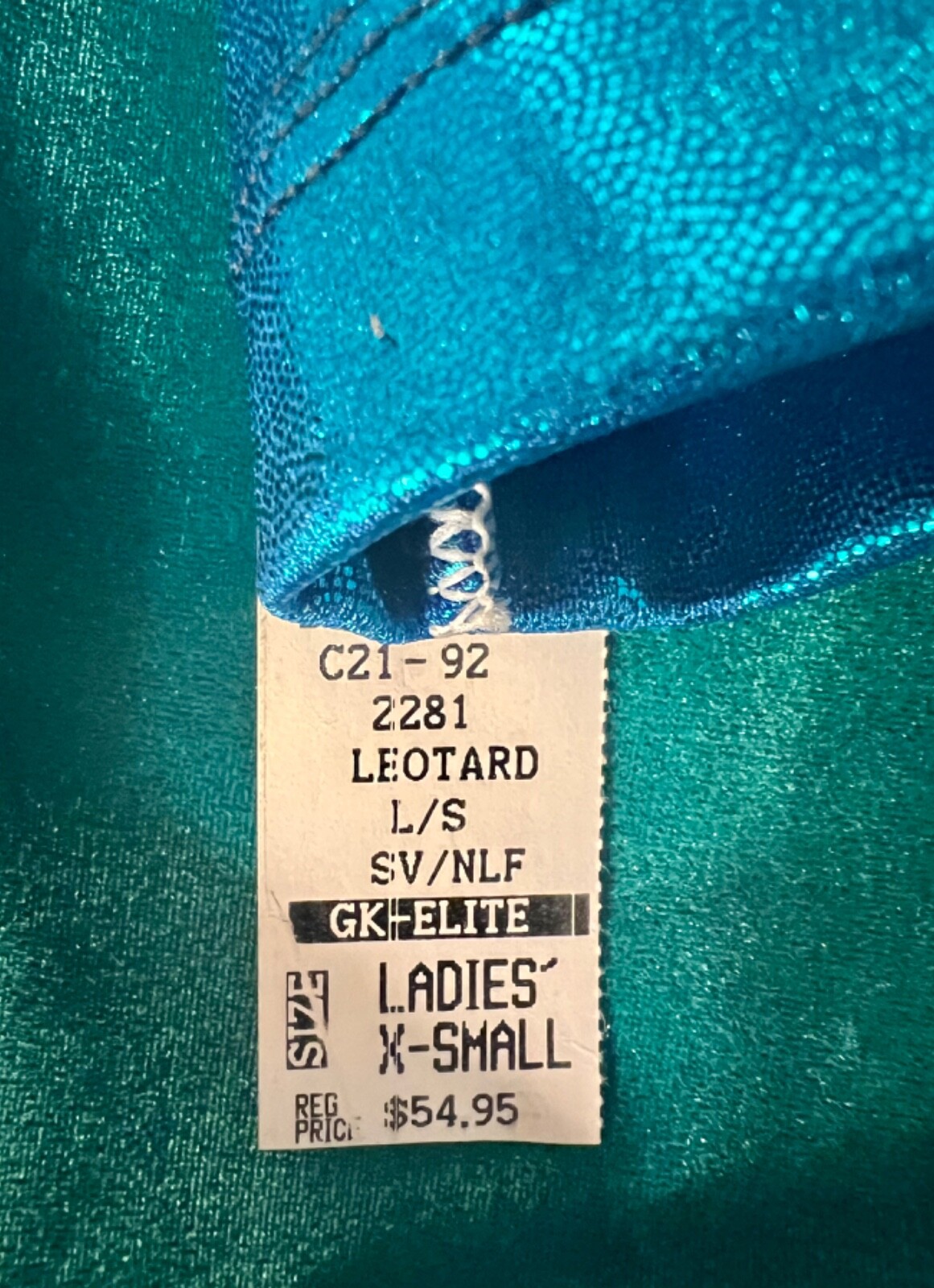 GK LADIES X-SMALL LgSLV GREEN VELVET BLUE FOIL GYMNASTICS DANCE LEOTARD SZ XS