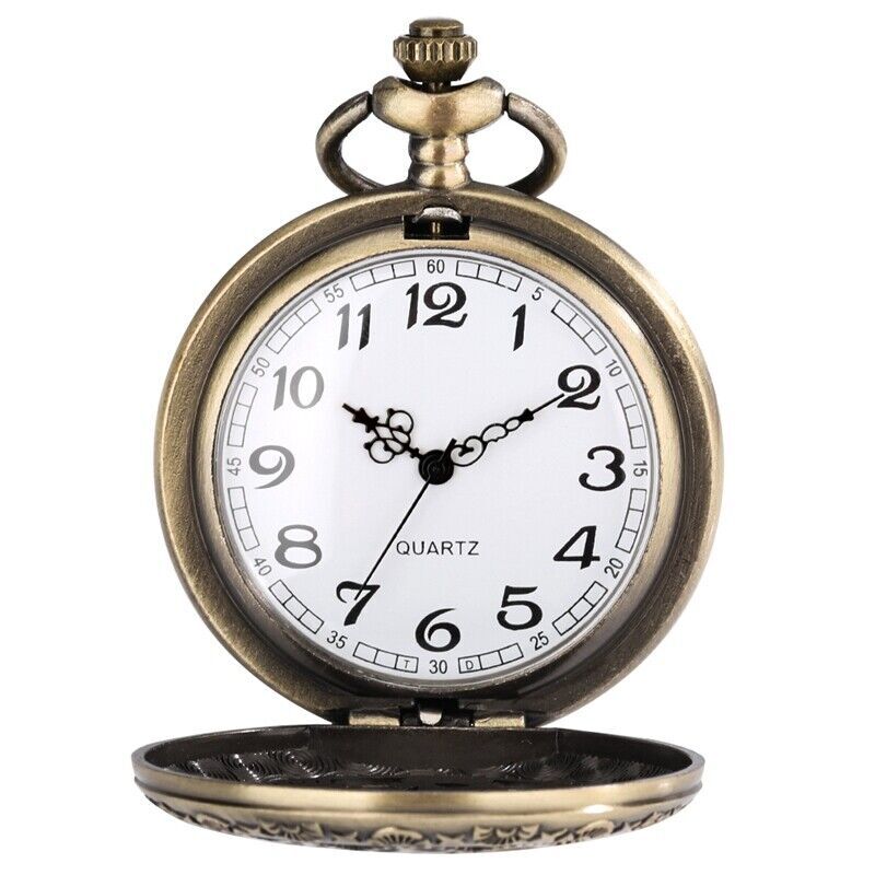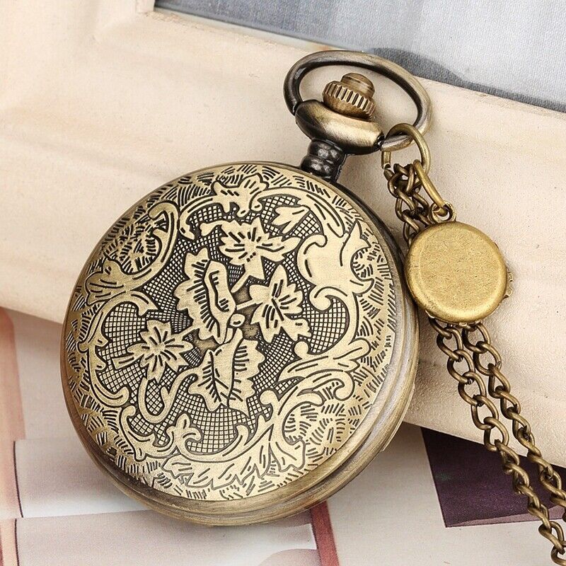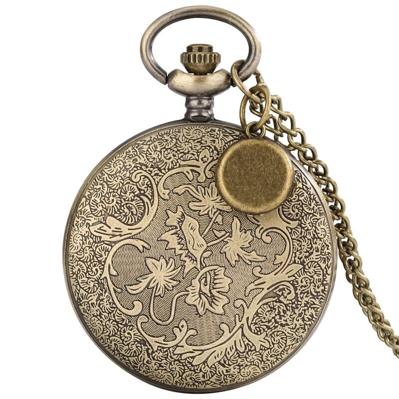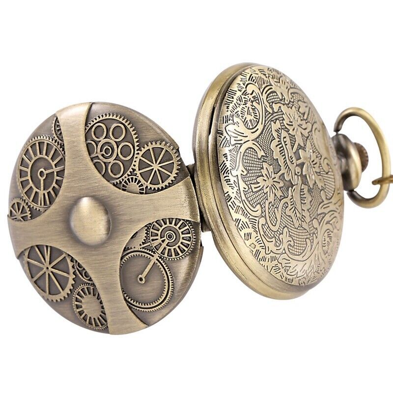 Bronze Engraved Gear Full Hunter Men Women Quartz Pocket Watch Necklace Chain