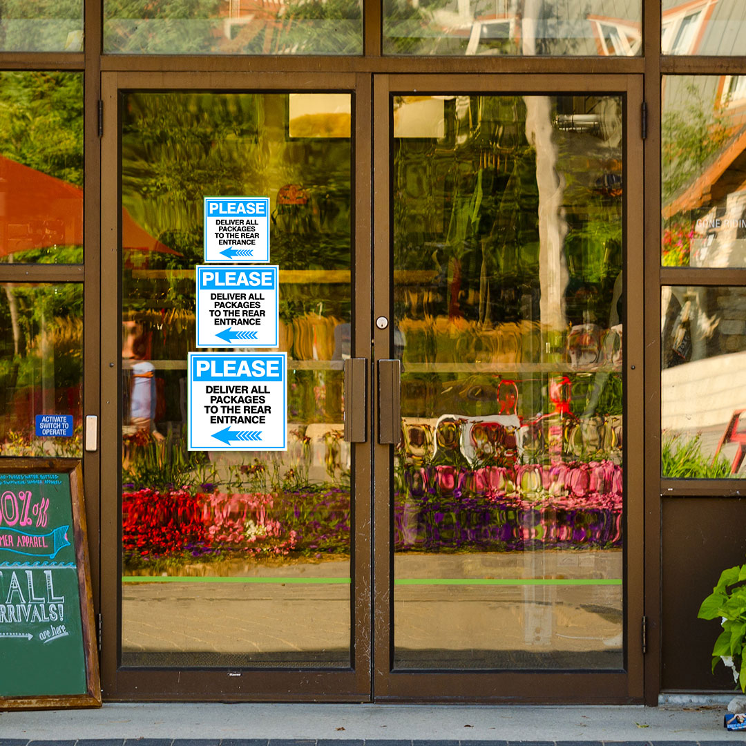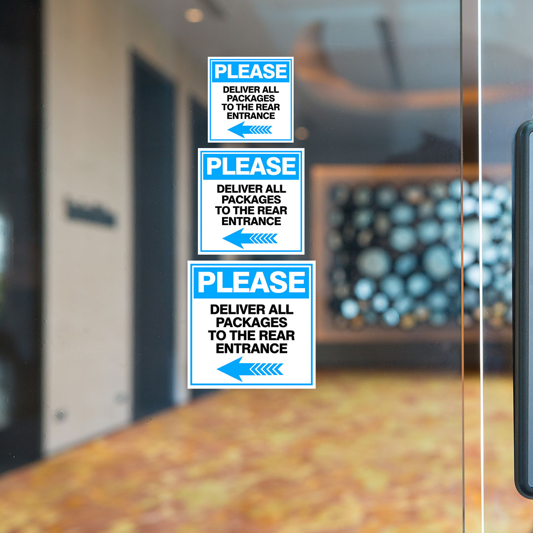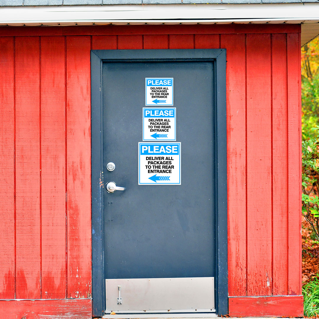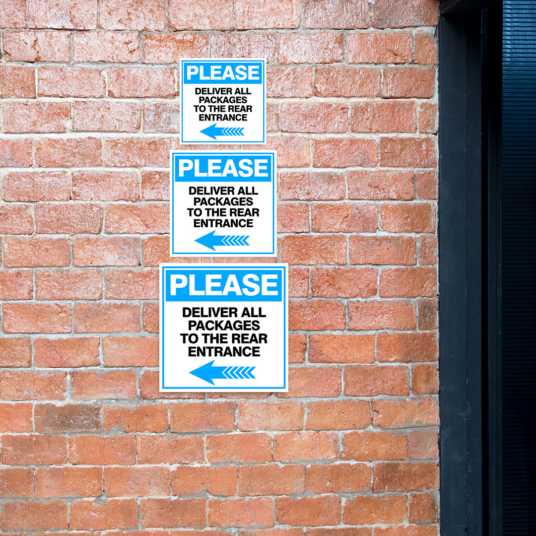 Square Plus Please Deliver All Packages To The Rear Entrance Left Arrow Sign