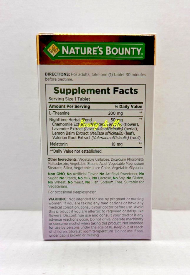 Ingredients: Valerian (Valeriana officinalis), L-Theanine, Lemon Balm (Melissa officinalis), Chamomile, Lavender (Lavandula)