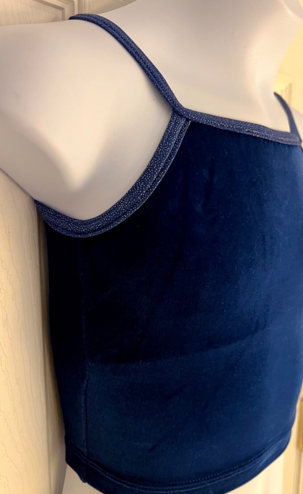 как выглядит GK DANCE JAZZ TOP GIRLS MEDIUM BLUE VELVET FOIL CRISSCROSS STRAPS CAMISOLE SZ M фото