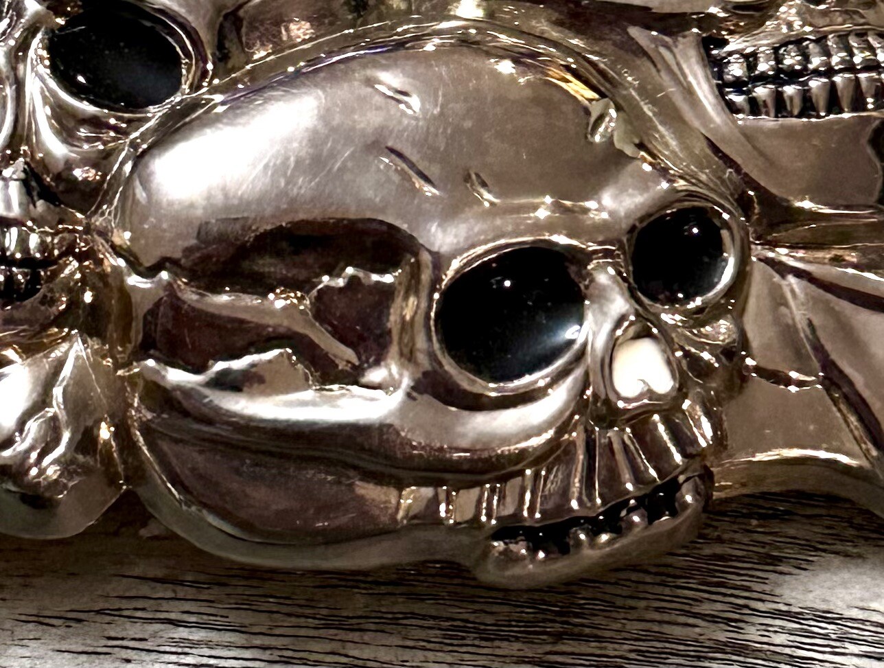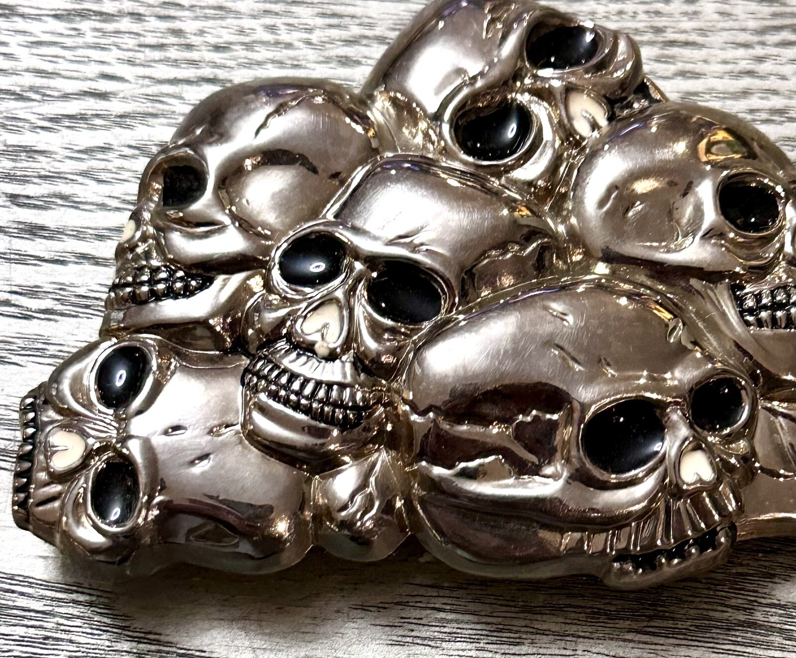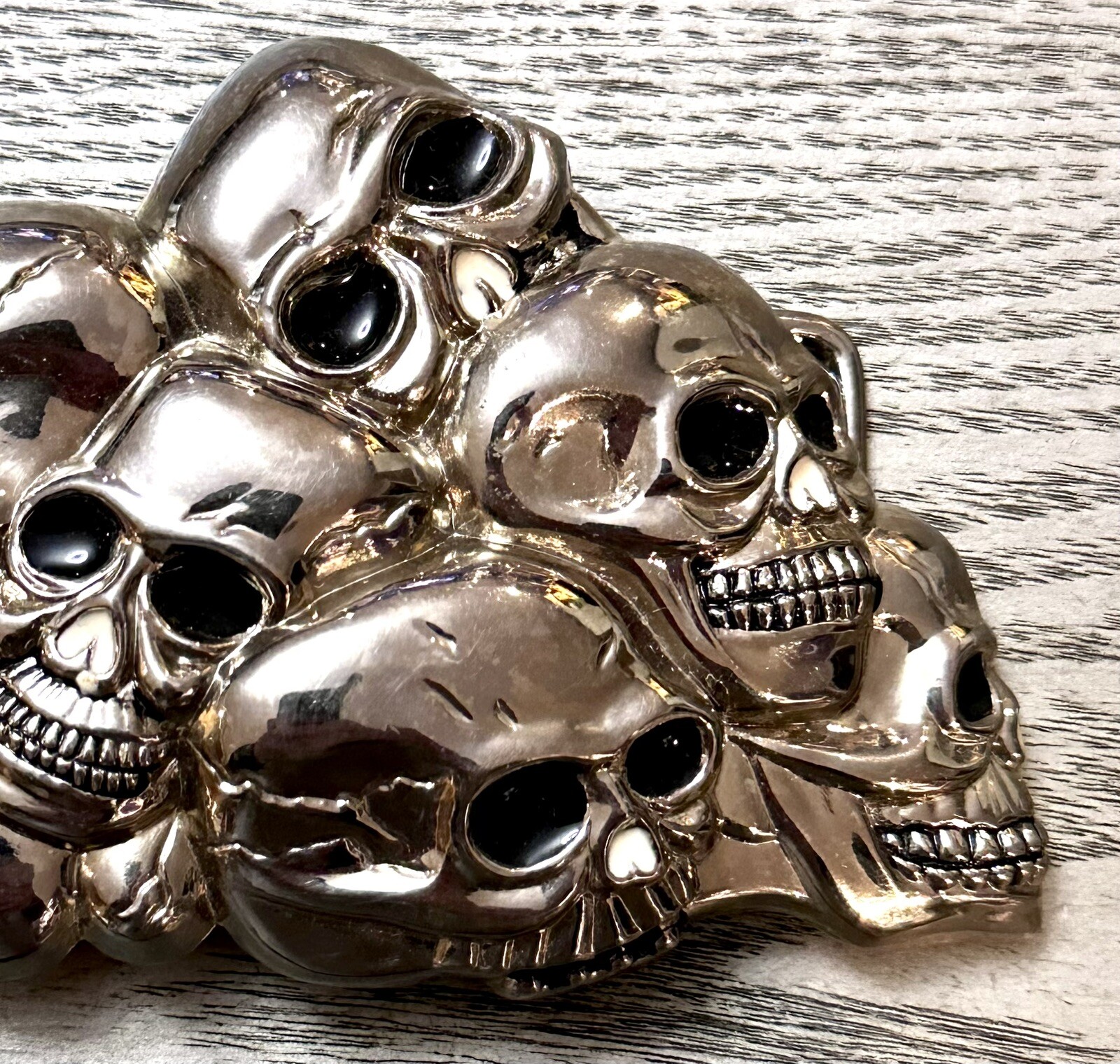 Vintage ORIGINAL 1970s Skull Biker Gothic CHROME Belt Buckle W/Inlay Eyes Nose