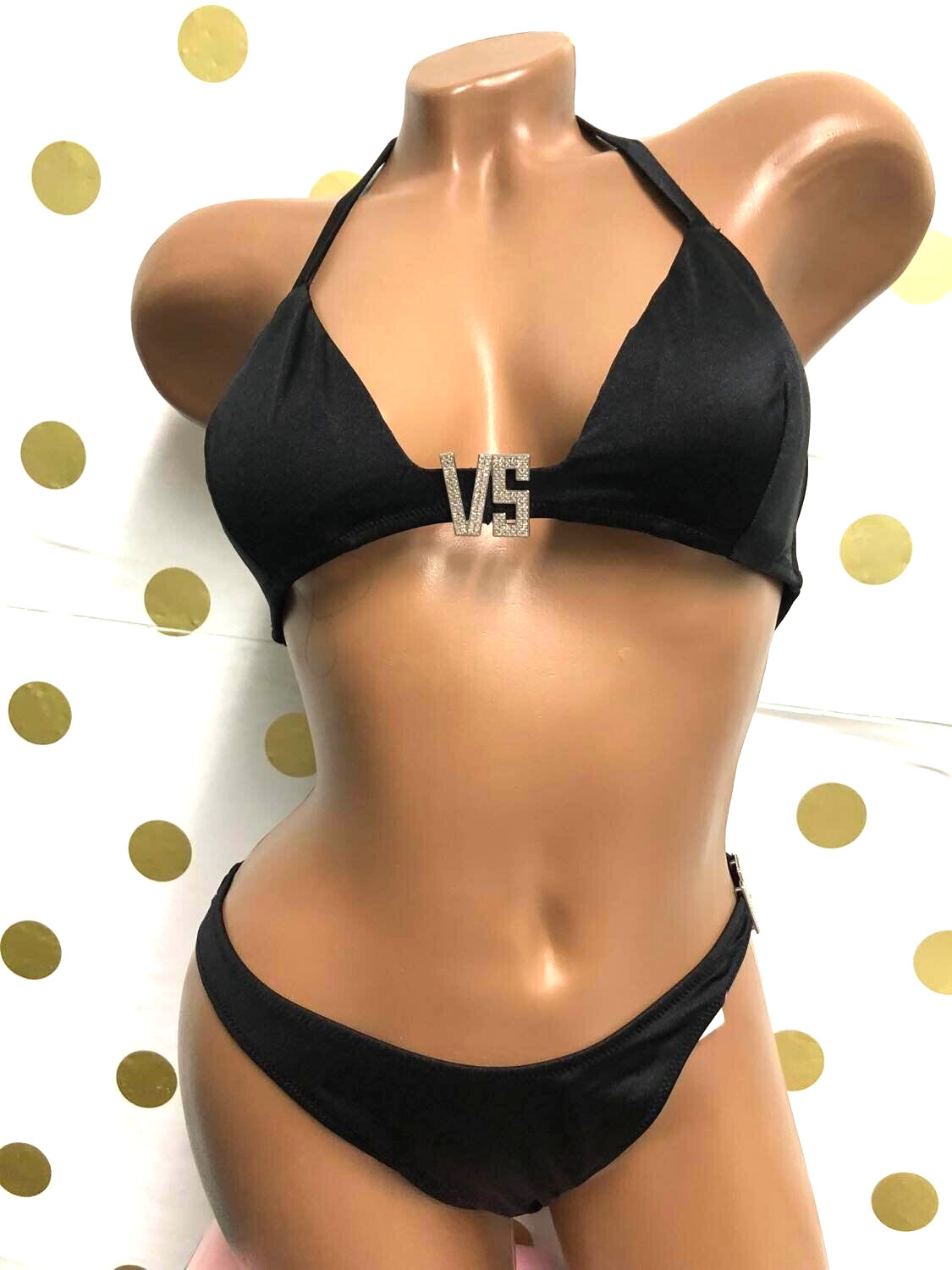 Victoria's Secret Black Embellished VS Shine Logo Swim Bikini 2 Piece Set NWT