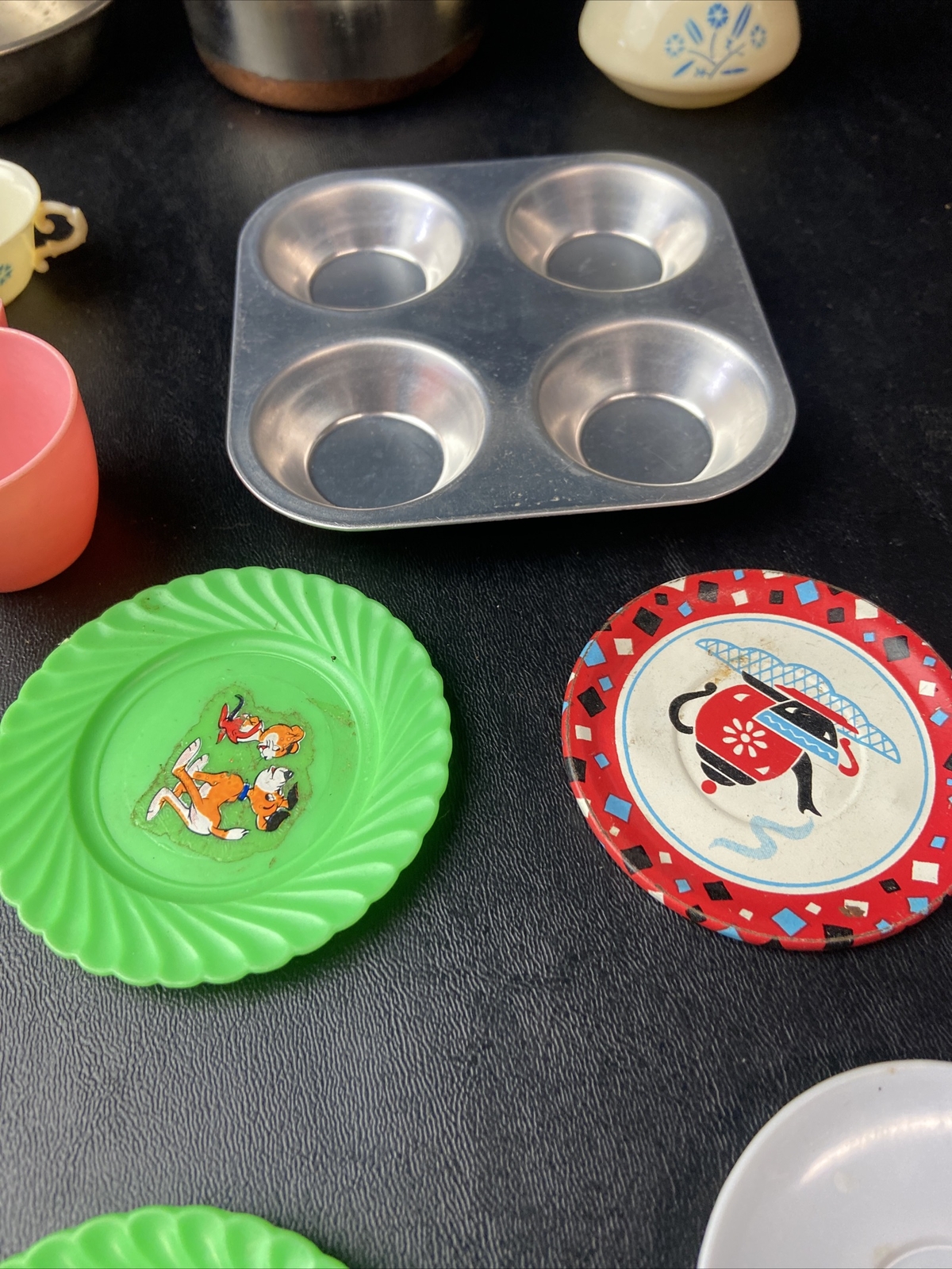 VTG LOT CHILD S PLASTIC TEA DINNER PLATES, PANS - HUGE SET