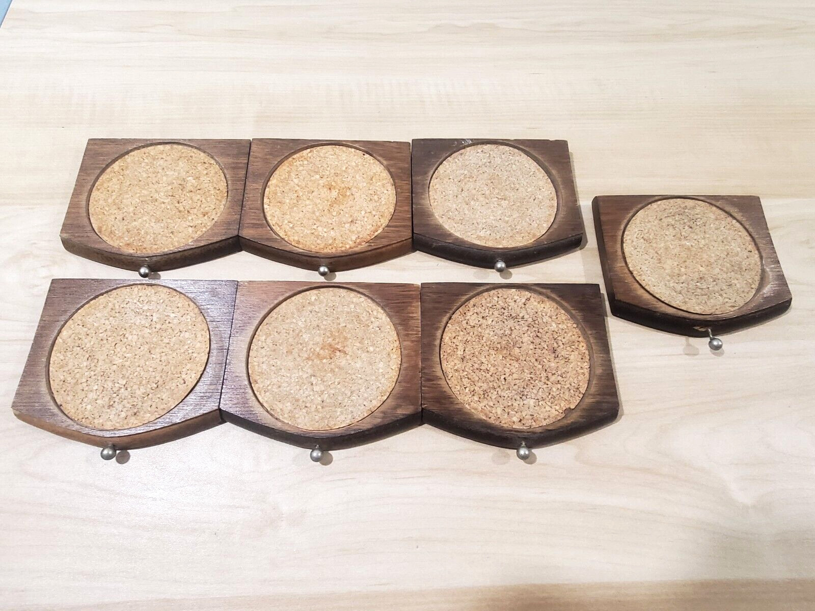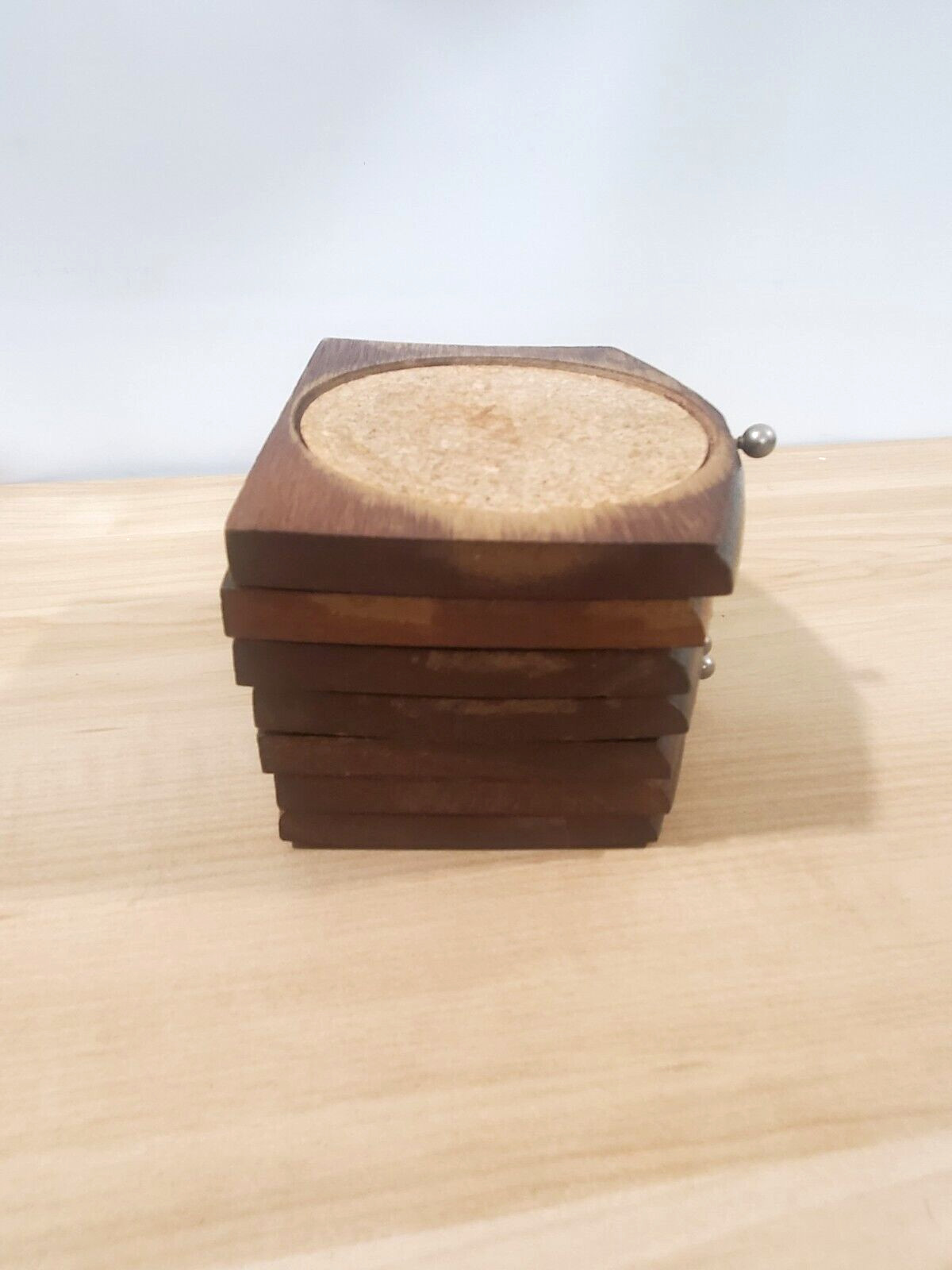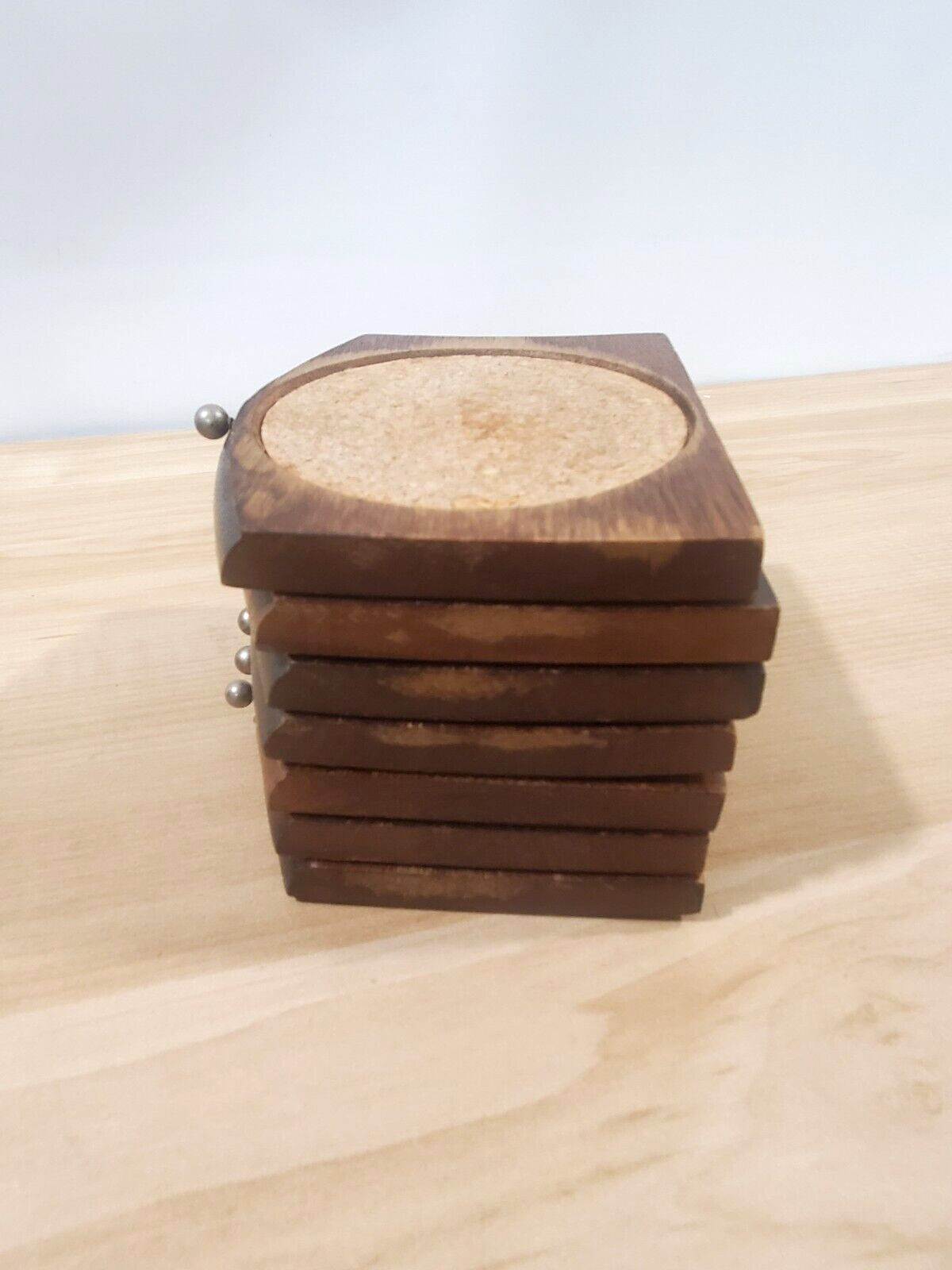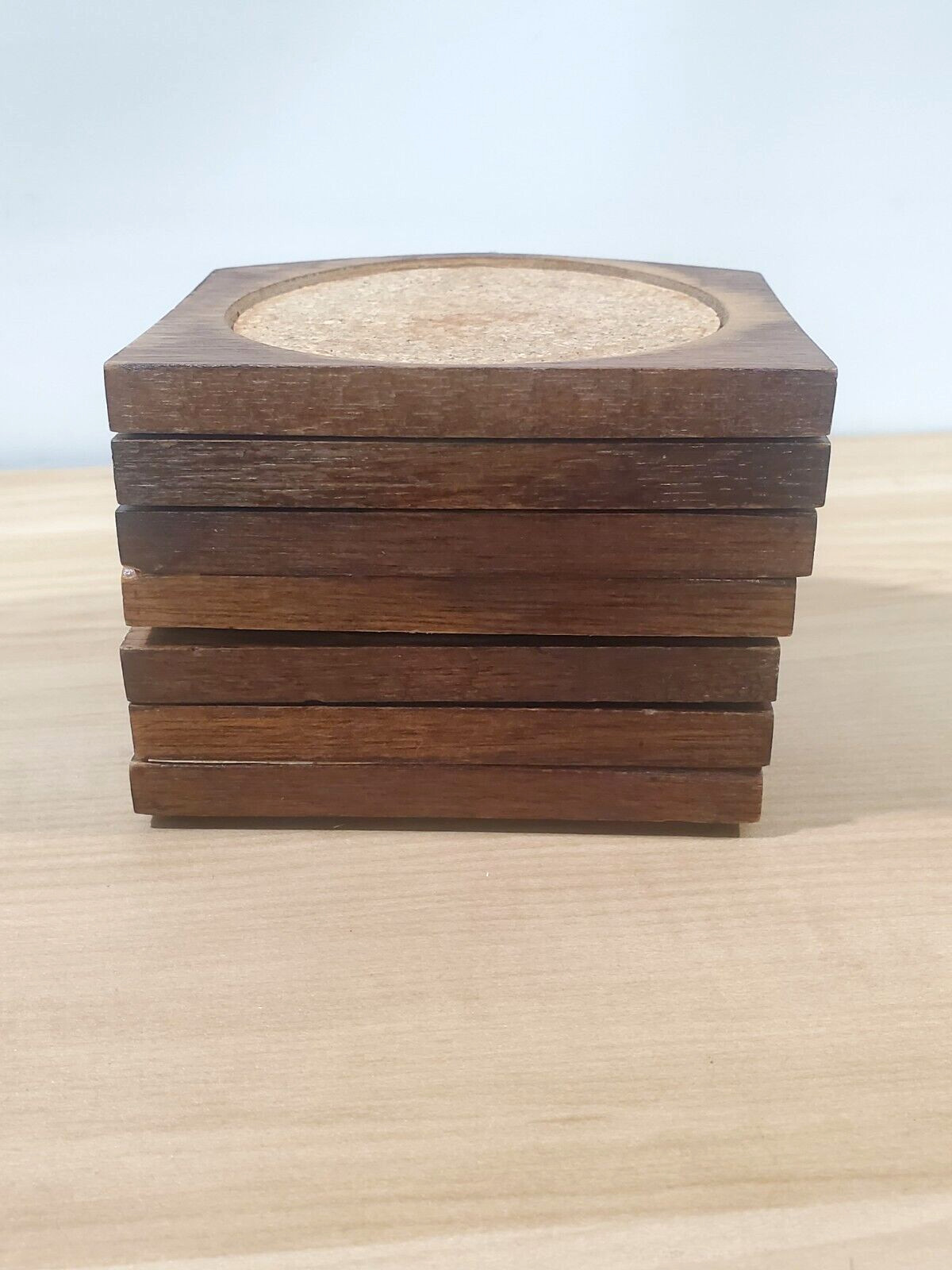 как выглядит Wood and Cork Coaster Set Holder w/Set of 7 Coasters Collectible FLAWED "AS IS" фото