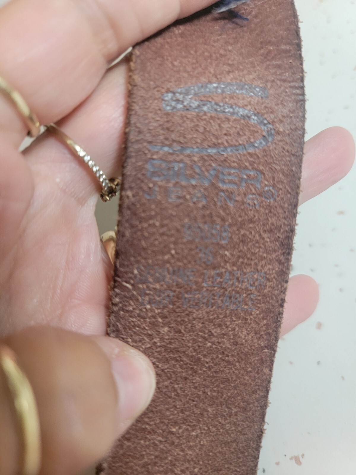 как выглядит BROWN LEATHER BELT WITH BRASS GOLDTONE SQUARE BUCKLE SAYS SILVER BRAND фото