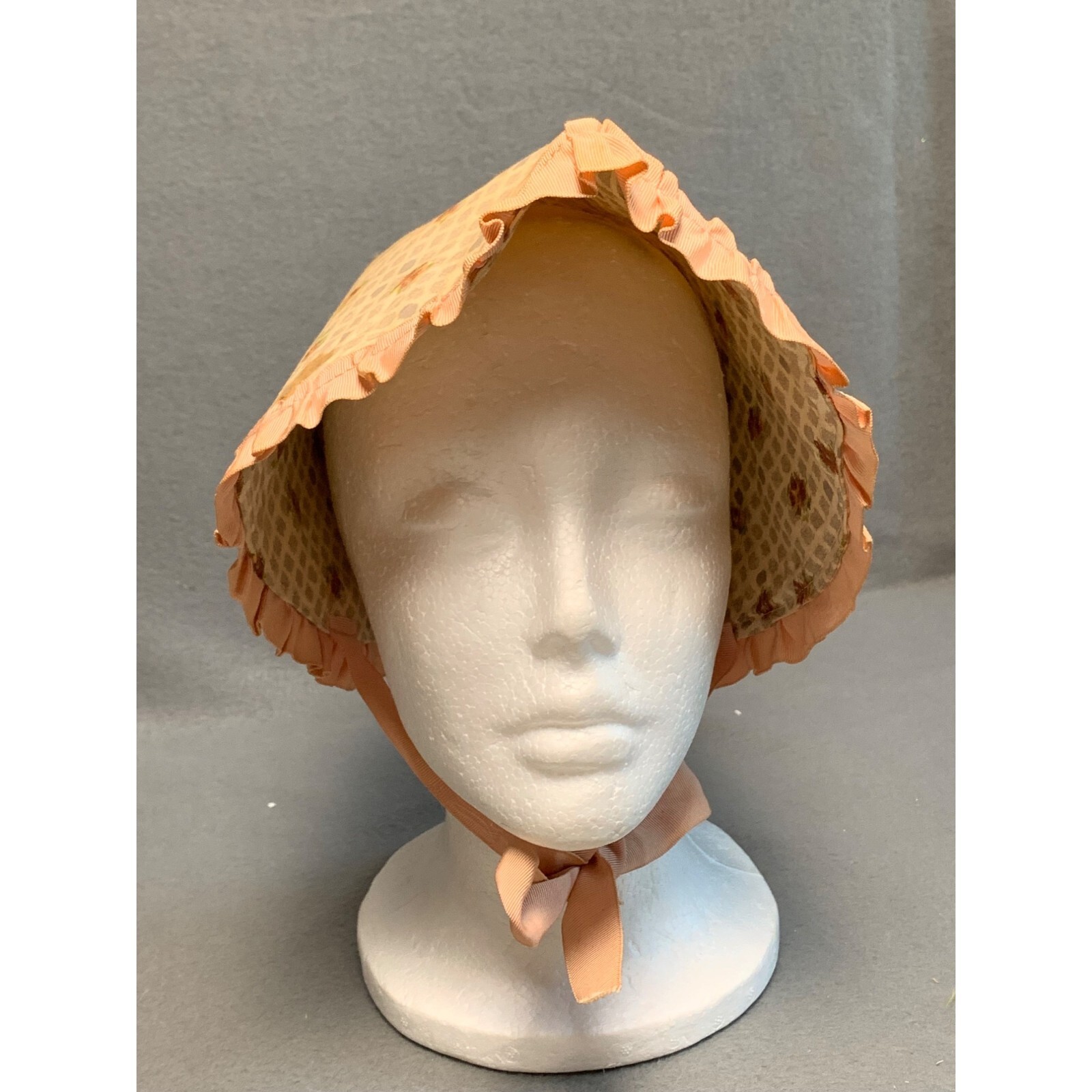 Vintage Womens Bonnet with Floral Pattern Peach Ruffle Trim
