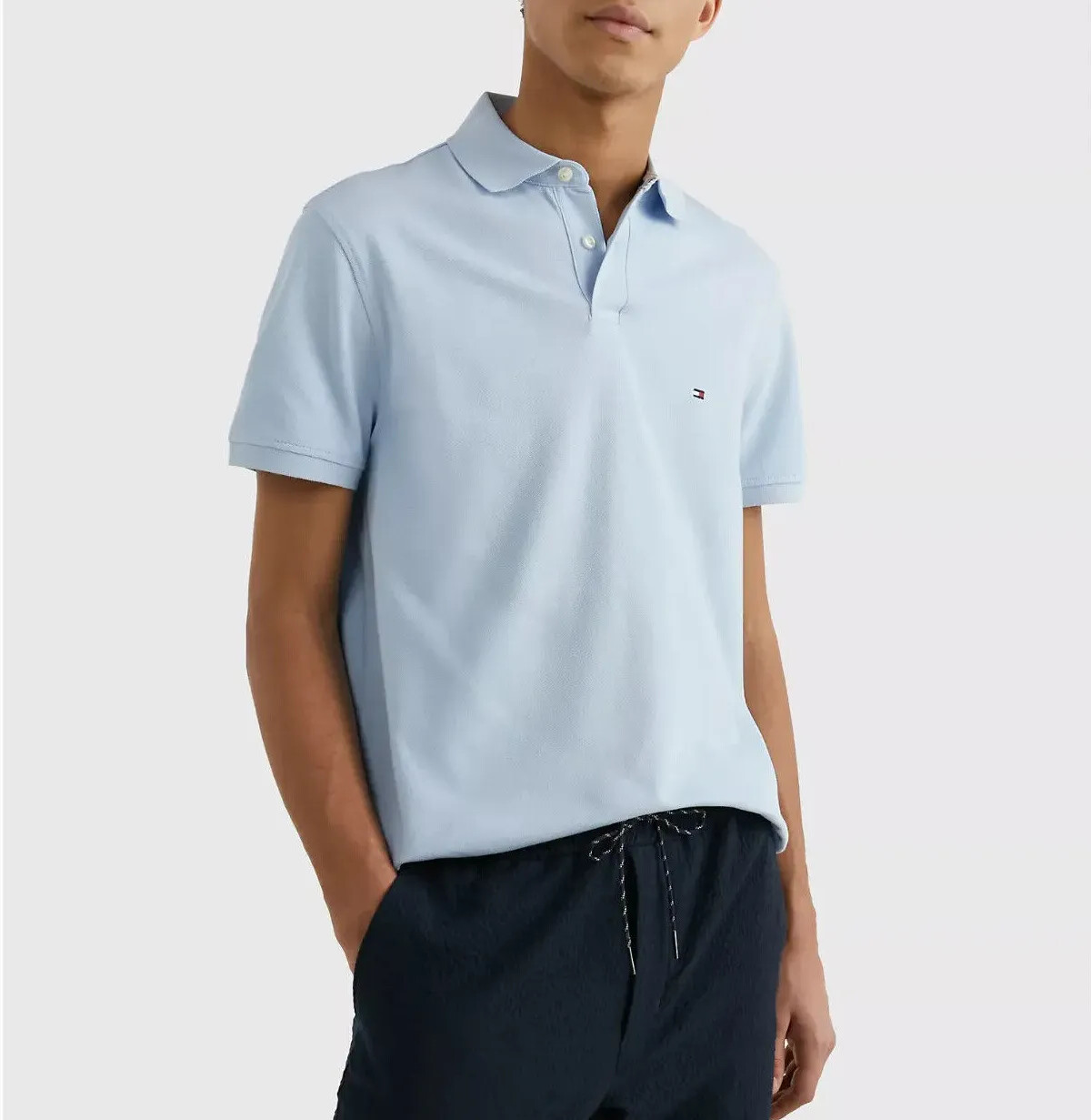 как выглядит Tommy Hilfiger Mens Regular Fit Solid Stretch Cotton Mesh Polo Shirt Sky Blue фото